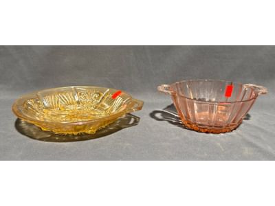 6006 Marigold Carnival Glass Divided Dish and Anchor Hocking Pink Depression Glass Bowl, 2”x5.5”, 8”