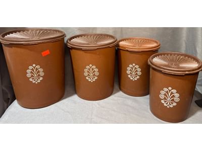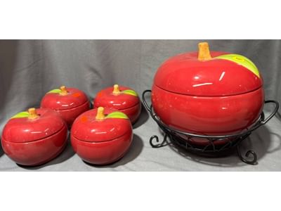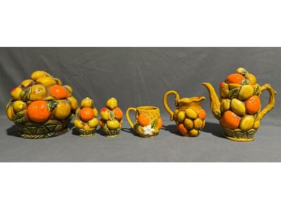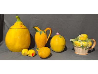 6016 Inarco Fruit-Themed Canister Inc. Salt and Pepper Shakers, Cup, Creamer, and Pitcher, 7.5”x5.5”, 4.5”, 3”x2.5”, 4.5”x3”, 7.5”x3.5”
