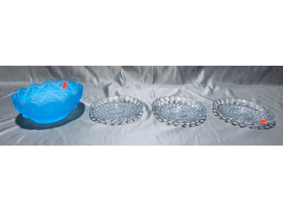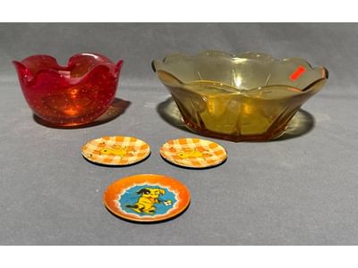 6021 Hand-Blown Red Glass Dish, Amber Glass Bowl, (3) Tin Plates, Dishes: 8”x3”, 5”x3”, 2.5”