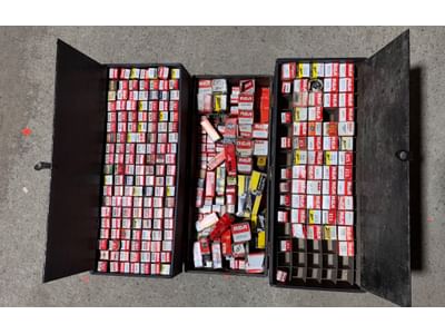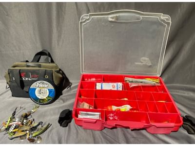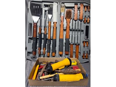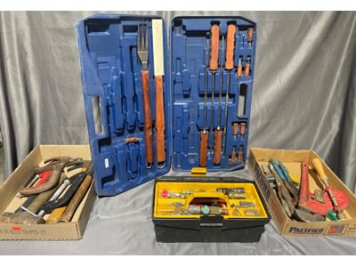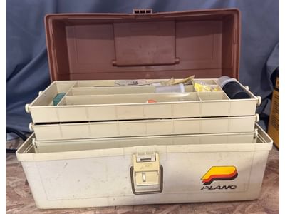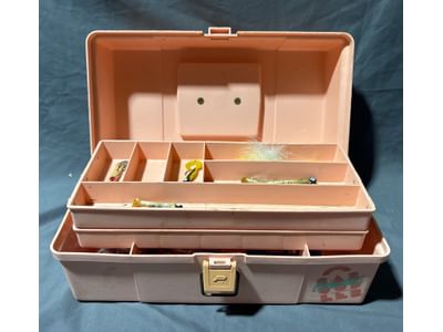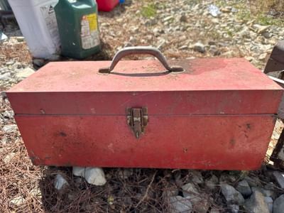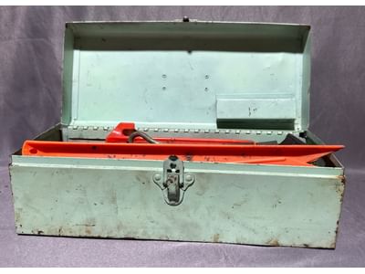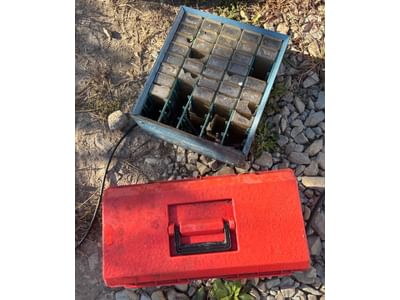 9693 Red Plastic Toolbox with Mixed Tools and Metal Battery Cell Case
