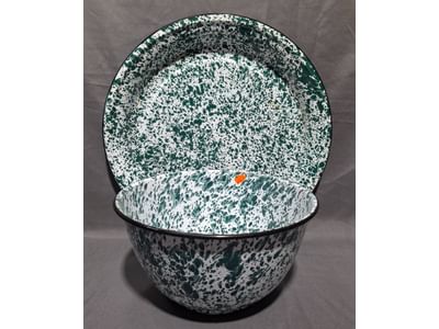 6048 Green and White Speckled Enamel Bowl and Tray 10.5?x6? & 16.5? Dia.