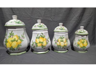 6049 Set of 4 Hand-Painted Italian Canisters with Lemon Motif 8?-12? Hgt. (Chips)