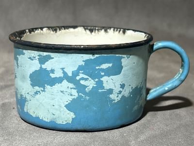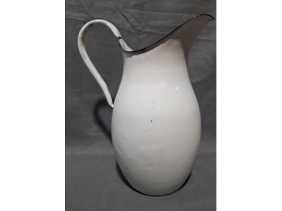6051 White Enameled Metal Pitcher With Blue Trim 5?x9? (rust)