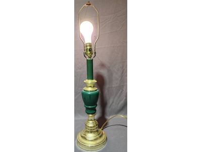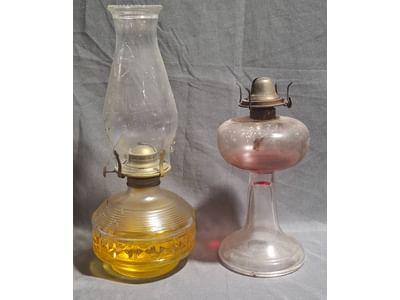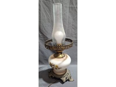 6054 Glass Hurricane Lamp with Floral Motif and Cast Iron Base 20.5? Hgt. (base missing leg, didn’t turn on)