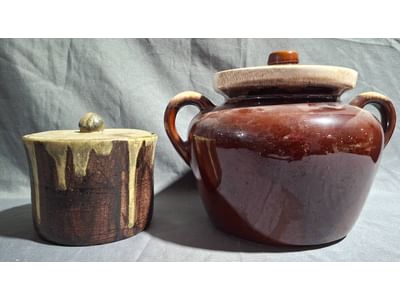 6056 McCoy Brown Glazed Bean Pot 342 & Stoneware Drip Glaze Lidded Jar 5?x5? & 9?x6.5?