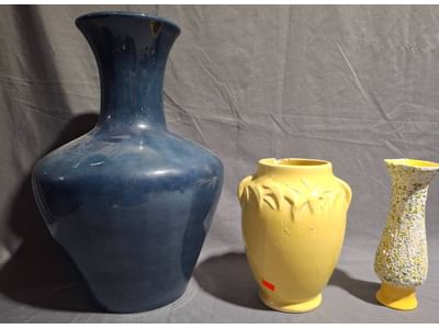 6057 McCoy Yellow Vase with Embossed Floral Motif. Textured Will-Ann Bud Vase & Blue Vase 8?-16? Hgt. (McCoy vase chipped)
