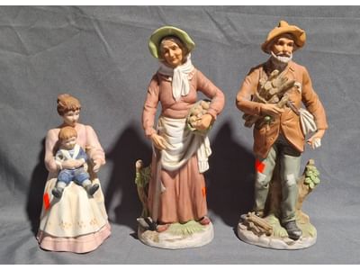6065 Homco Old Man and Woman Figurines and Mother and Son Figurine with Underglaze Blue Markings 7?-10?(cracks & broken arm)