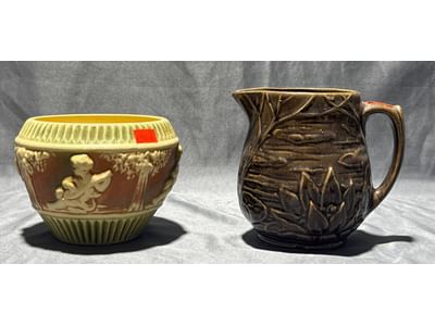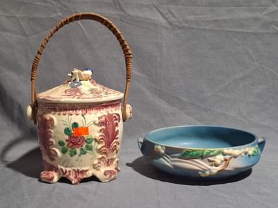 6066 Biscuit Jar with Hand-Painted Florals Made in Japan and Roseville Pottery Planter 5.5?x9? & 6.5?x2? (biscuit jar lid broken)
