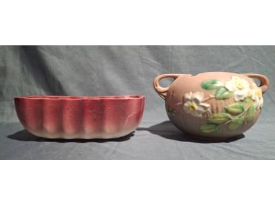 6067 Roseville Pottery Handled Planter & Pink Rectangular Planter 7.5?x4? & 8?x2.5? (crazing)