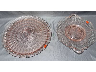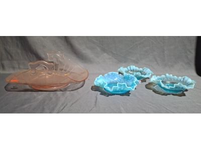 6069 Pink Depression Glass Double Handled Dish and Fenton Blue Opalescent Ruffled Dishes, 5? & 10?x8?