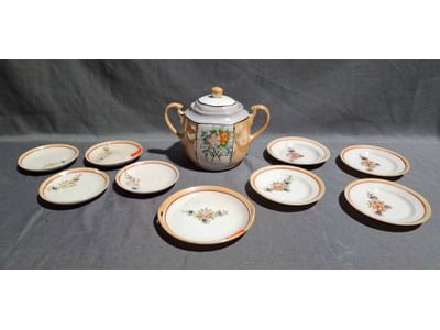 6080 Peach Lusterware Hand-Painted Porcelain Sugar Bowl and 9 Saucers, Made in Japan 3? – 6?x4? (one chipped)