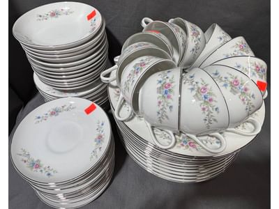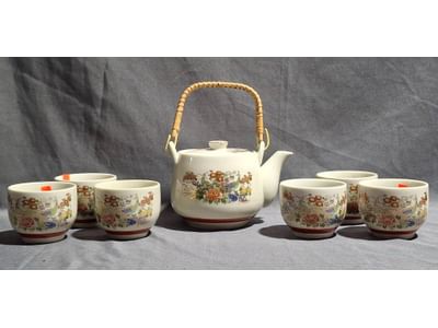 6081 Porcelain Teapot with Bamboo Handle and 6 Cups, UCG Japan 3?x2.5? & 6?x4? (crazing)