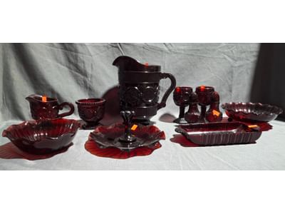 6082 Avon Cape Cod Ruby Red Pressed Glassware Inc. Pitcher, Sugar, Creamer, Goblets, Salt & Pepper Shakers, Footed Serving Bowl and More, 4?-9?
