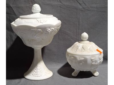 6087 Milk Glass Compote and Lidded Dish with Grape Motif 5?x6? & 7?x11?