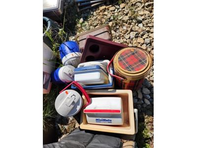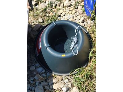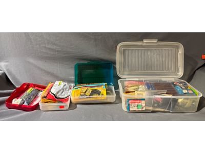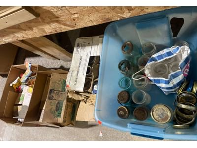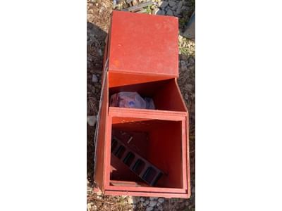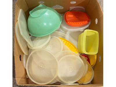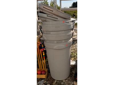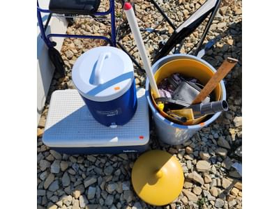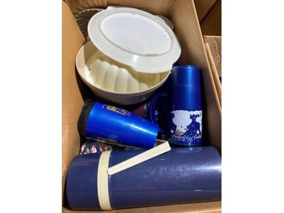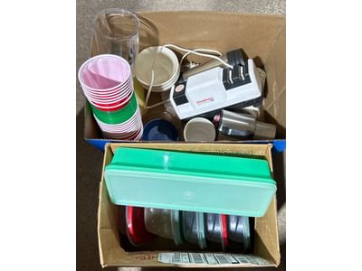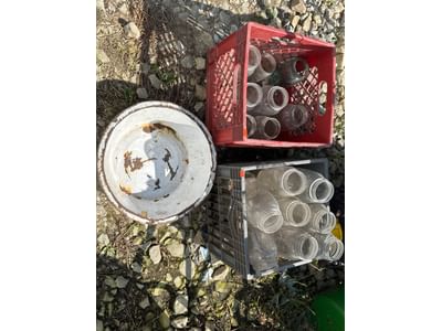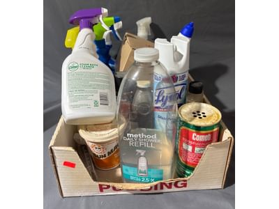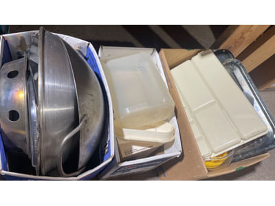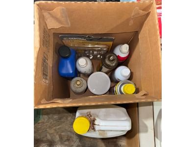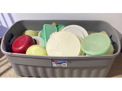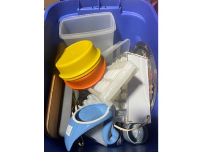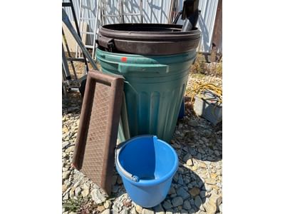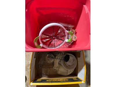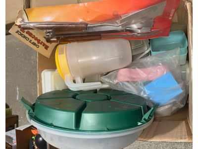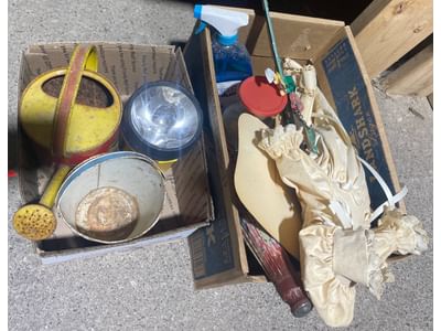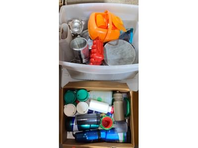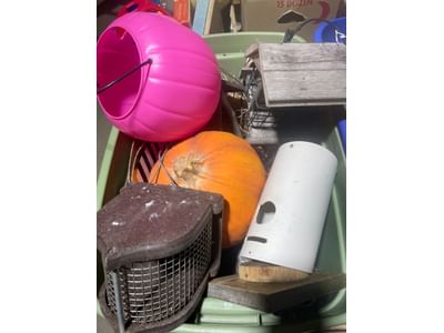 9650 Utility Items with Plastic Containers Birdhouse and umbrella weight
