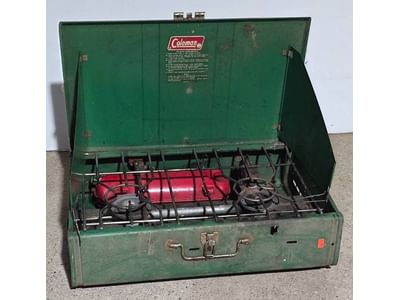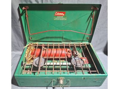 9662 Coleman Green Metal Portable Camp Stove with Components 17”x11.5”x4.5”