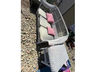 9635 White Wicker Couch & Table with Cushions (Wearing Visible)