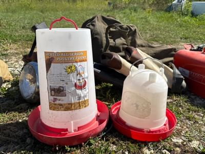 9673 (2) Plastic Poultry Feeders with Red Bases, 16” and 10”