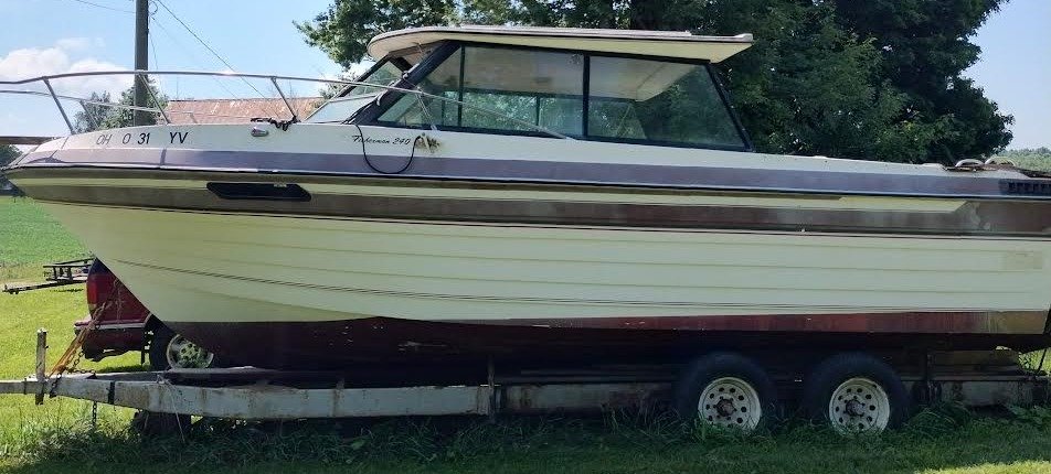10002 1987 Thompson Marine Boat and Trailer, Boat floor needs replaced, 1 window needs replaced, motor on boat ran 5 years ago and it was winterized at that time, the trailer CANNOT be pulled - it needs all new tires and 1 new rim, Boat Has Title, Trailer Does NOT Have a Title, VIN:TMS26786E787 - THIS BOAT WILL HAVE A $25 TITLE FEE ADDED TO THE WINNING INVOICE -- PICK UP AT ALTERNATE LOCATION SILVER LAKE, INDIANA