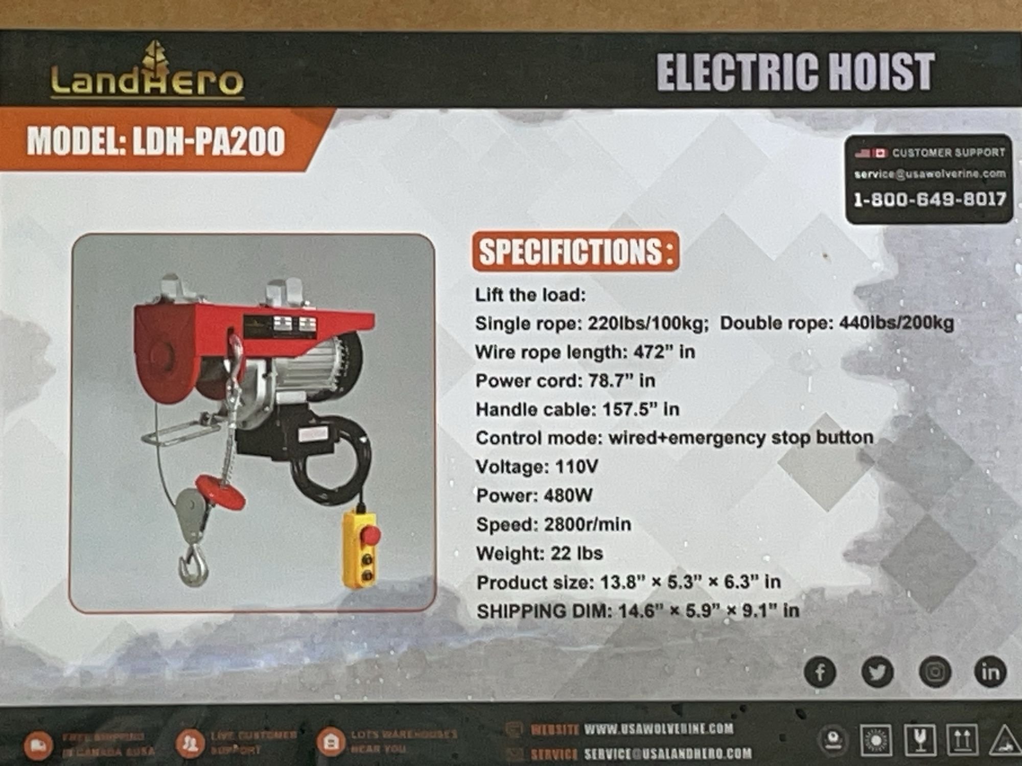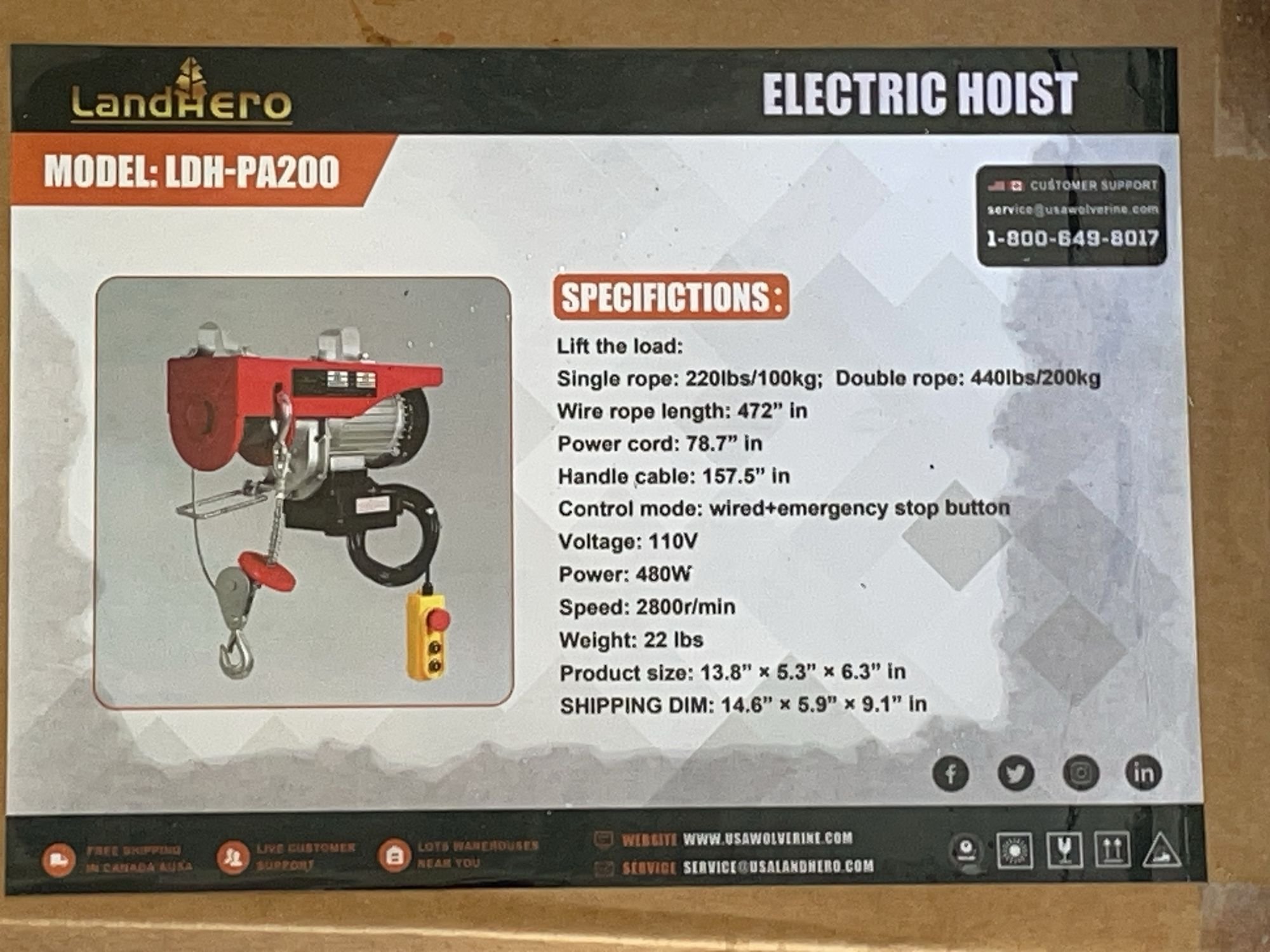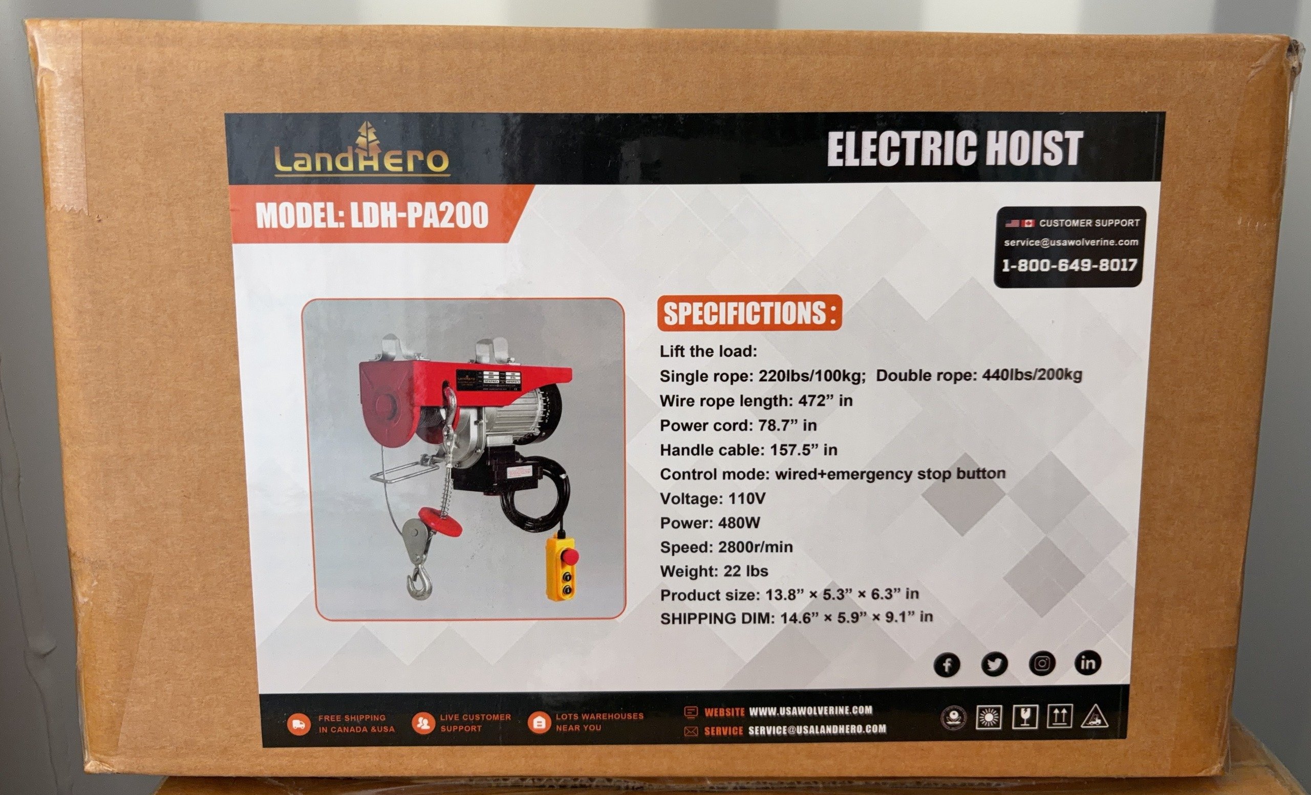 12024 Land Hero electric hoist model LDH-PA200 in factory sealed box