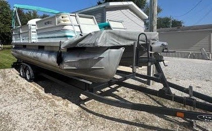 6458 1997 Crest Boats by Maure Pontoon Boat with trailer, runs, seller just did $2300 updates, boat and trailer both have titles, BOAT VIN MAU02002C797, TRAILER VIN 4PGBP24218L038520 - A $25 TITLE FEE WILL BE ADDED TO THE WINNING INVOICE