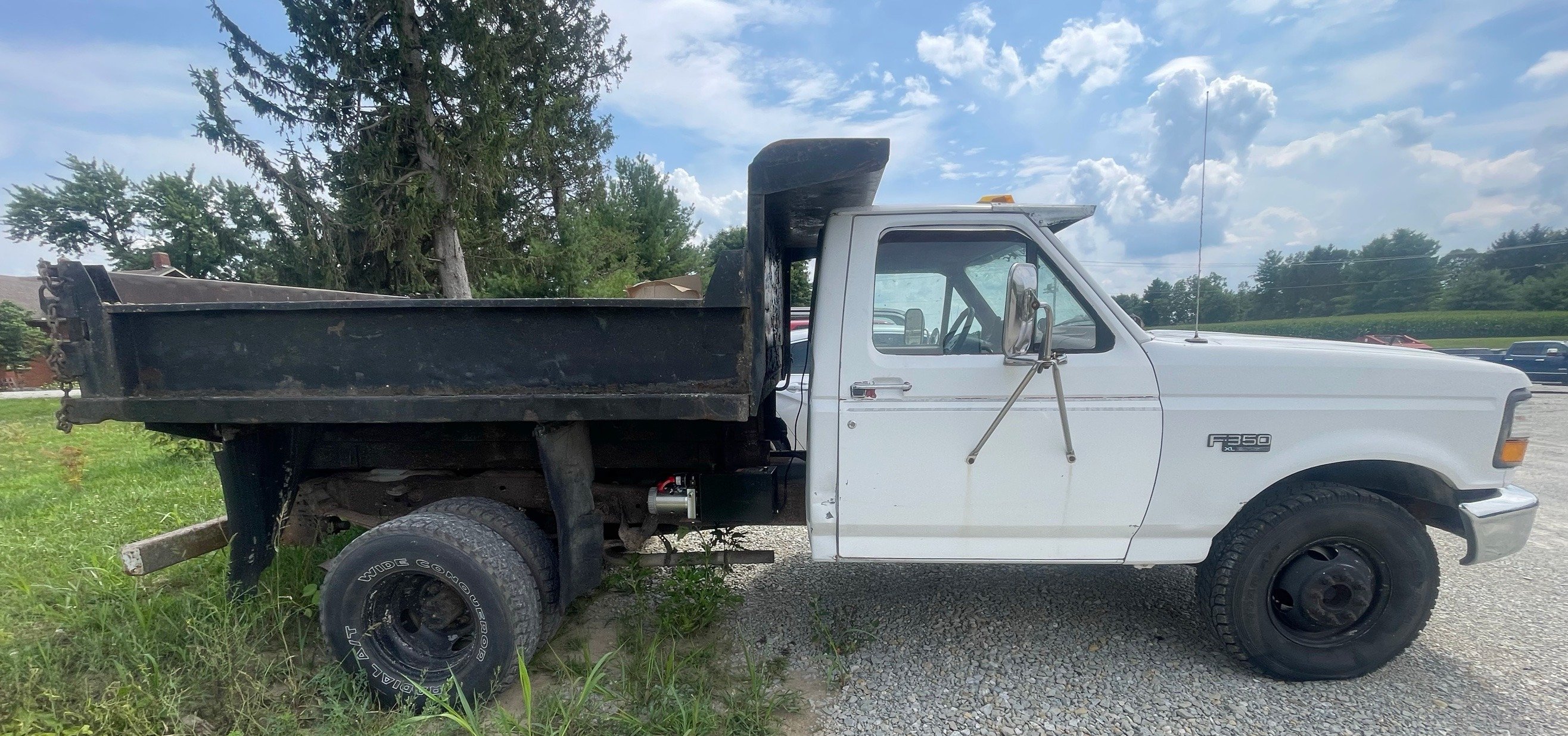 7708 1996 Ford F350 Dump Truck, 141,381 Miles, Runs & Drives, 7.5 V8 Gas Engine, Has 2 Fuel Tanks, Dump Bed Works, Has New Electric Pump, AC Works, Has Title, VIN: 1FTJF35GXTEA77475 - A $25 TITLE FEE WILL BE ADDED TO THE WINNING INVOICE