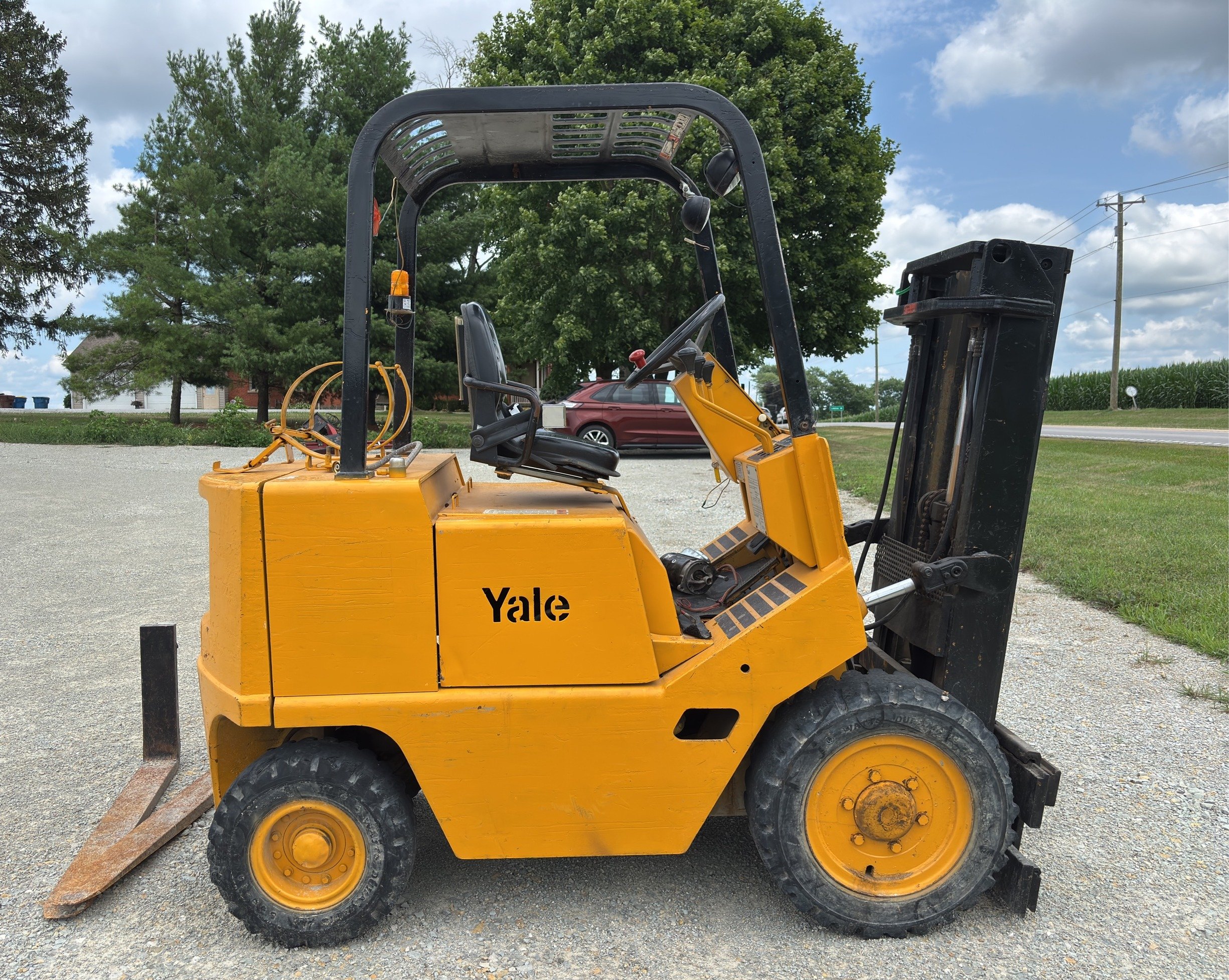 7719 Yale 4000lb Capacity fork lift GP-040-SANFBD-075, 4000lbs,108" lift height, Will Not Start, solid pneumatic tires, new plugs, cap, roter, fuel lockoff and fuel converter, needs new flex plate due to ring gear damage - WILL NOT START