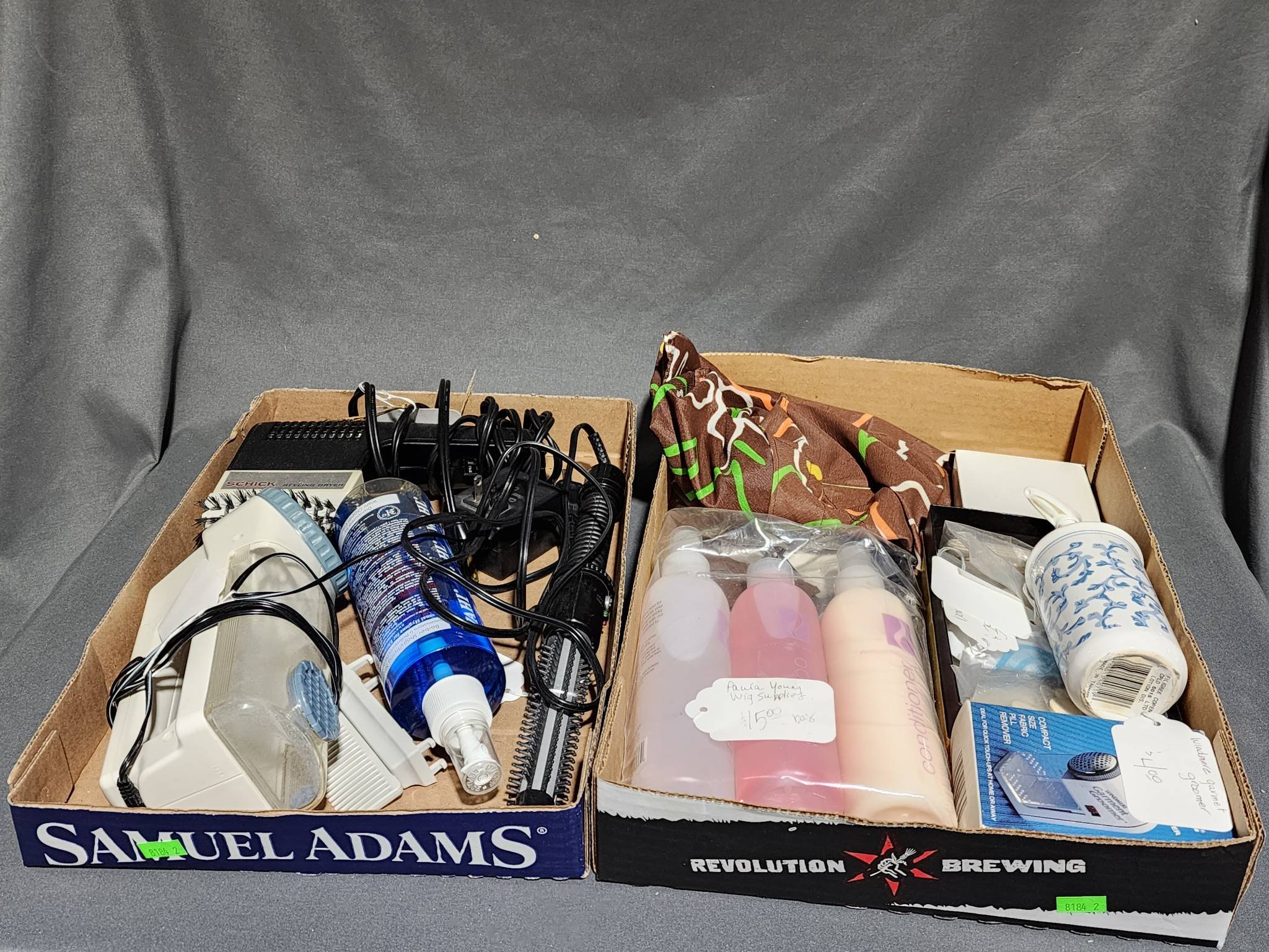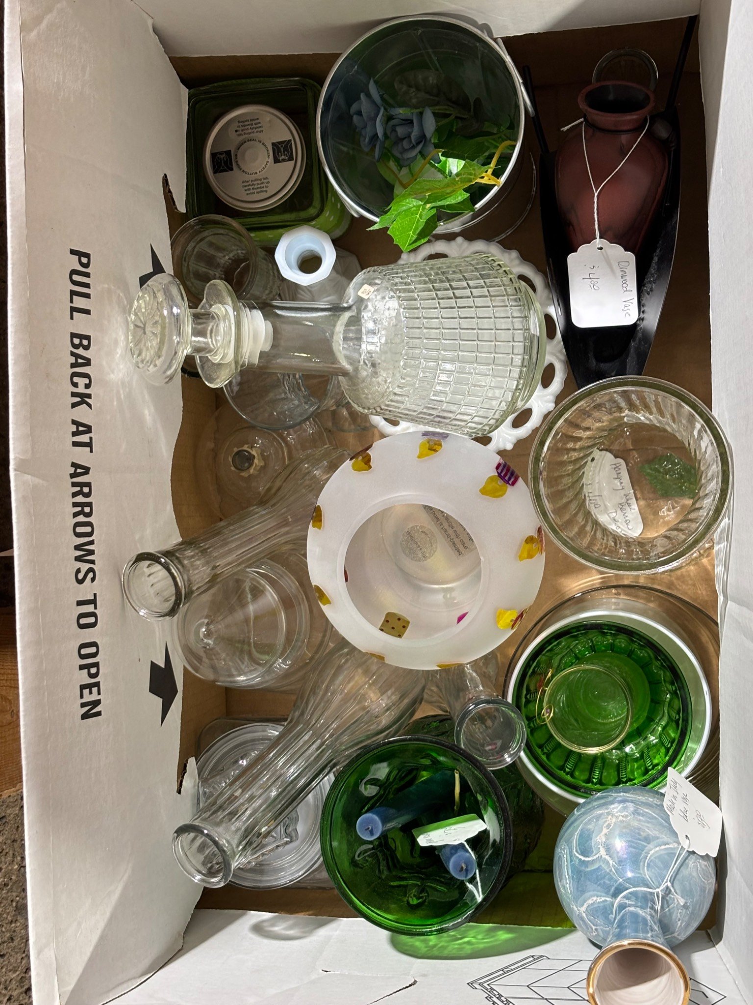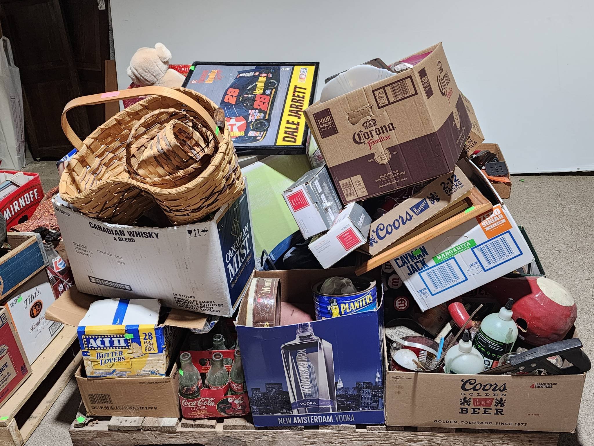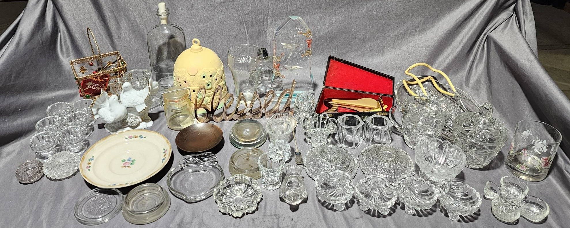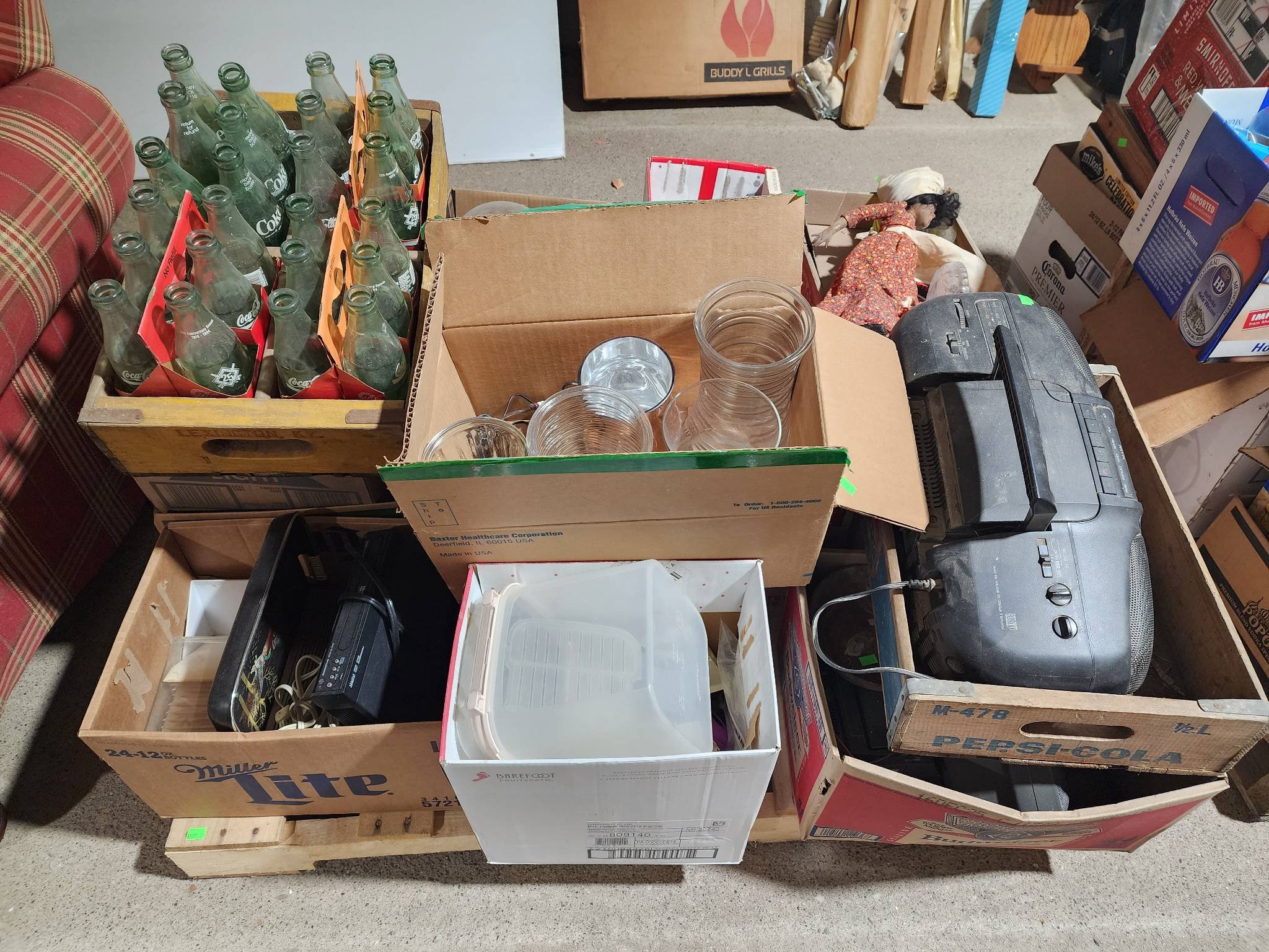 55002 Household Items Inc. Glass Bottles, Plasticware, Electronics, and Wood Crates