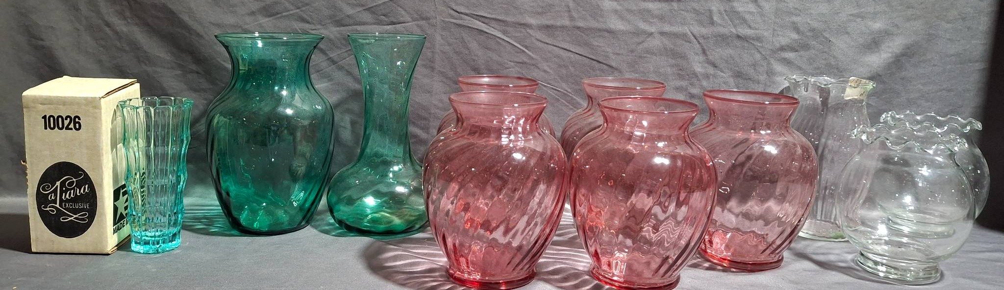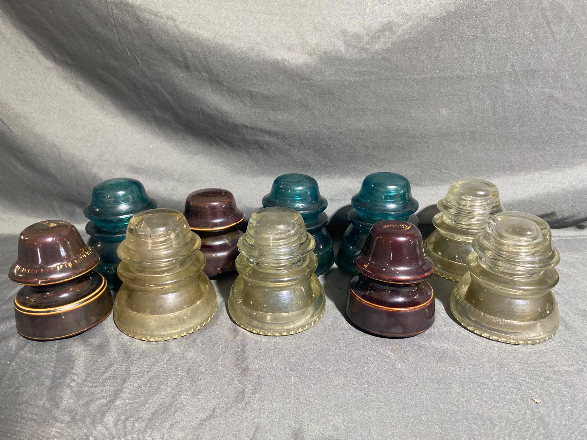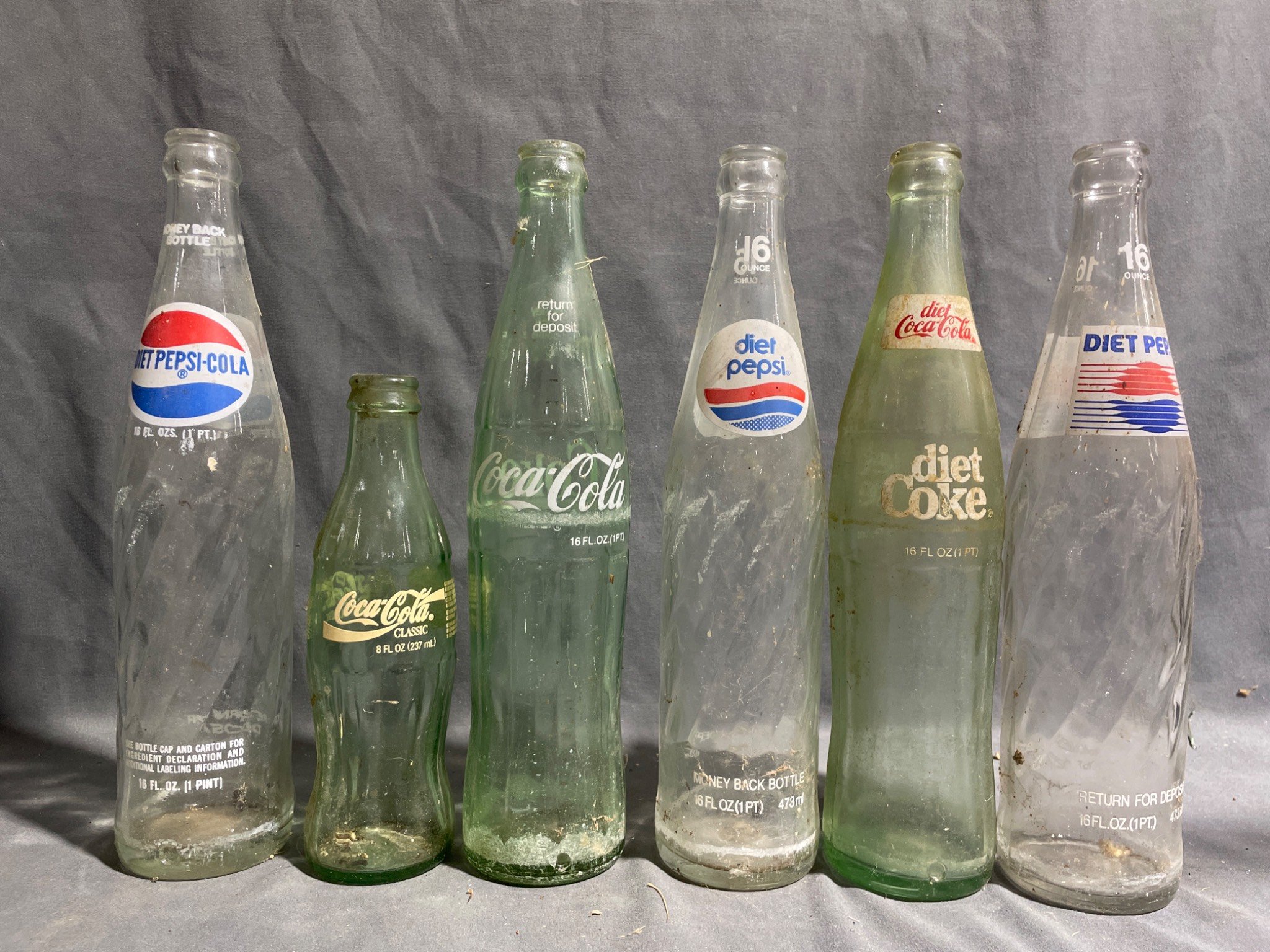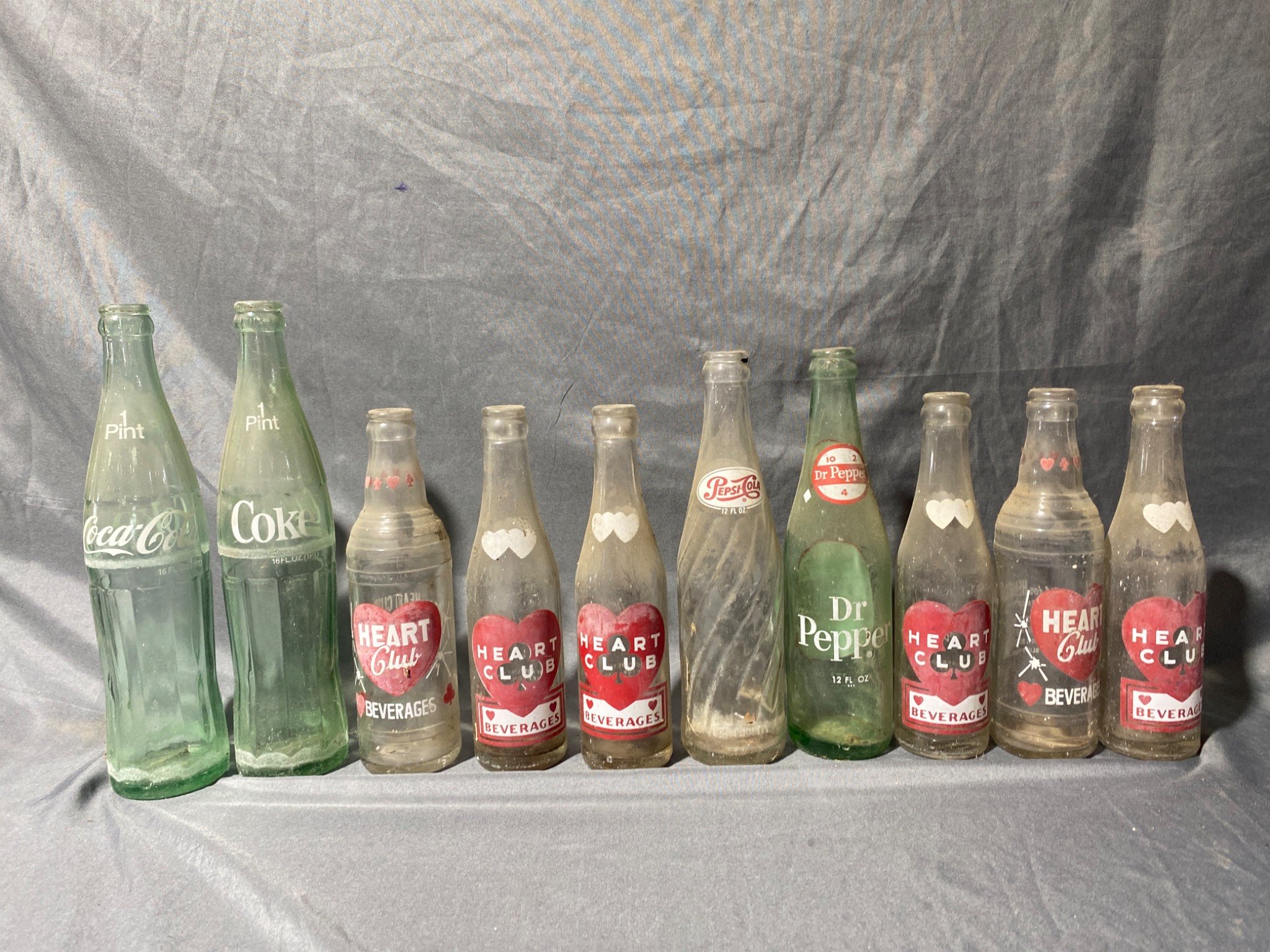 55010 10 Glass Soda Bottles Inc. Coca Cola, Dr Pepper and Pepsi-Cola 8”-11”H