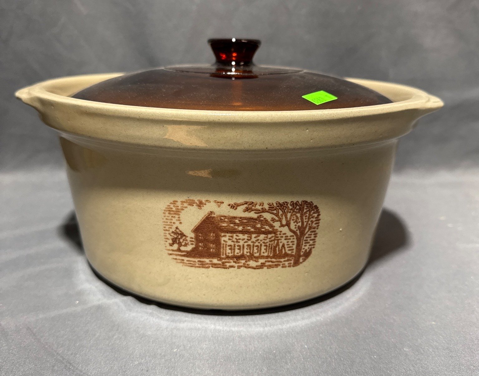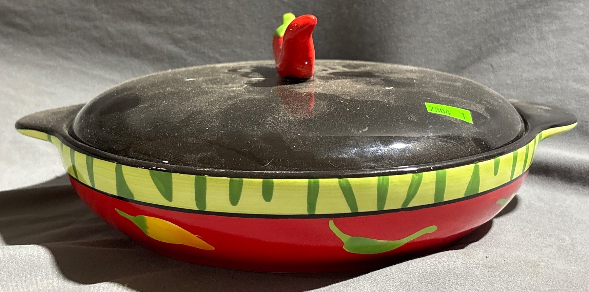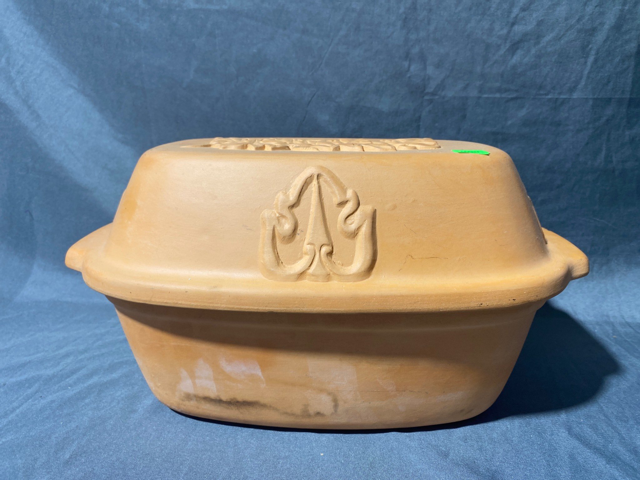 55017 Unglazed Clay Baking Dish with Lid, Embossed Details, 13”x7”x8”