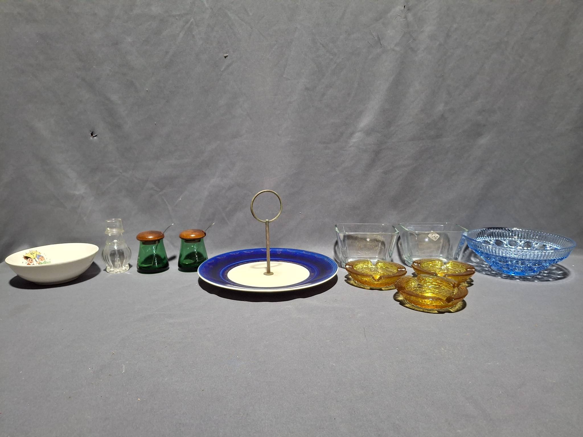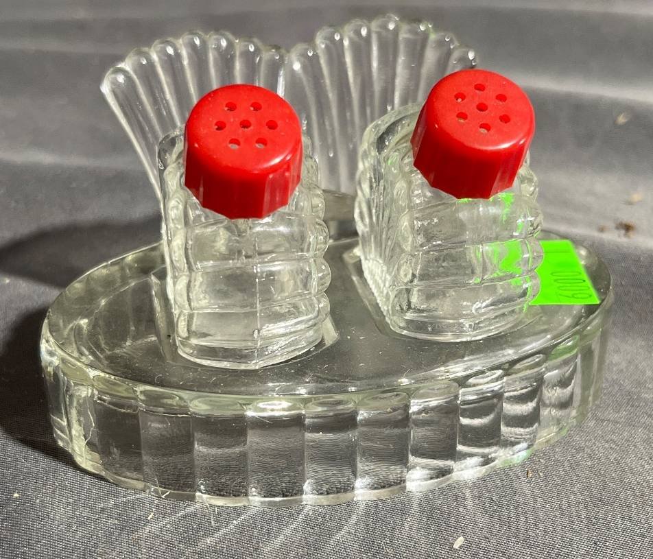 6000 Glass Salt and Pepper Shakers with Red Lids and Matching Glass Tray 4”
