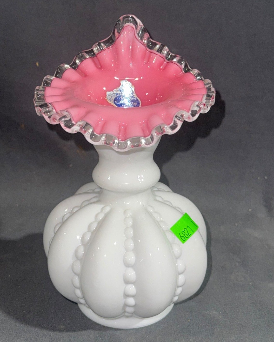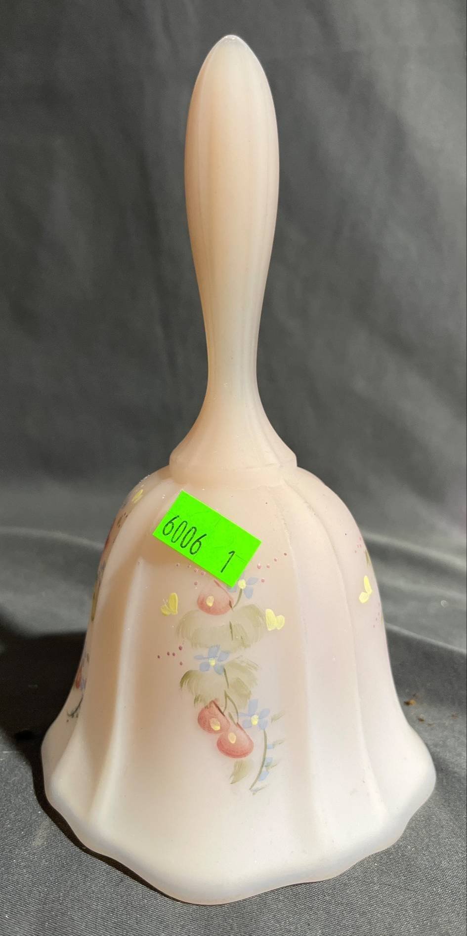 6006 Fenton Pink Satin Glass Bell with Hand-Painted Floral Design by K. Fleming 7”