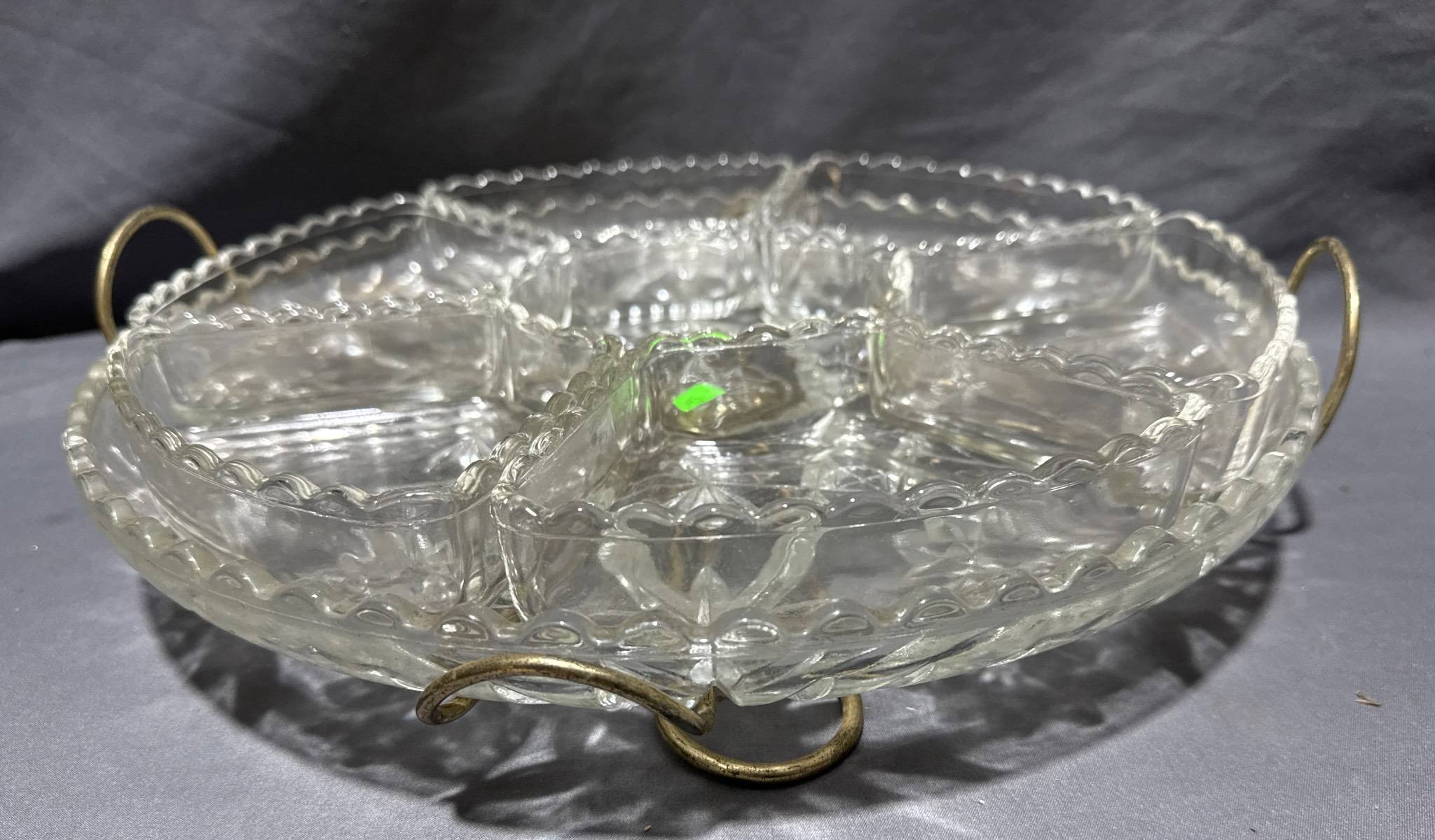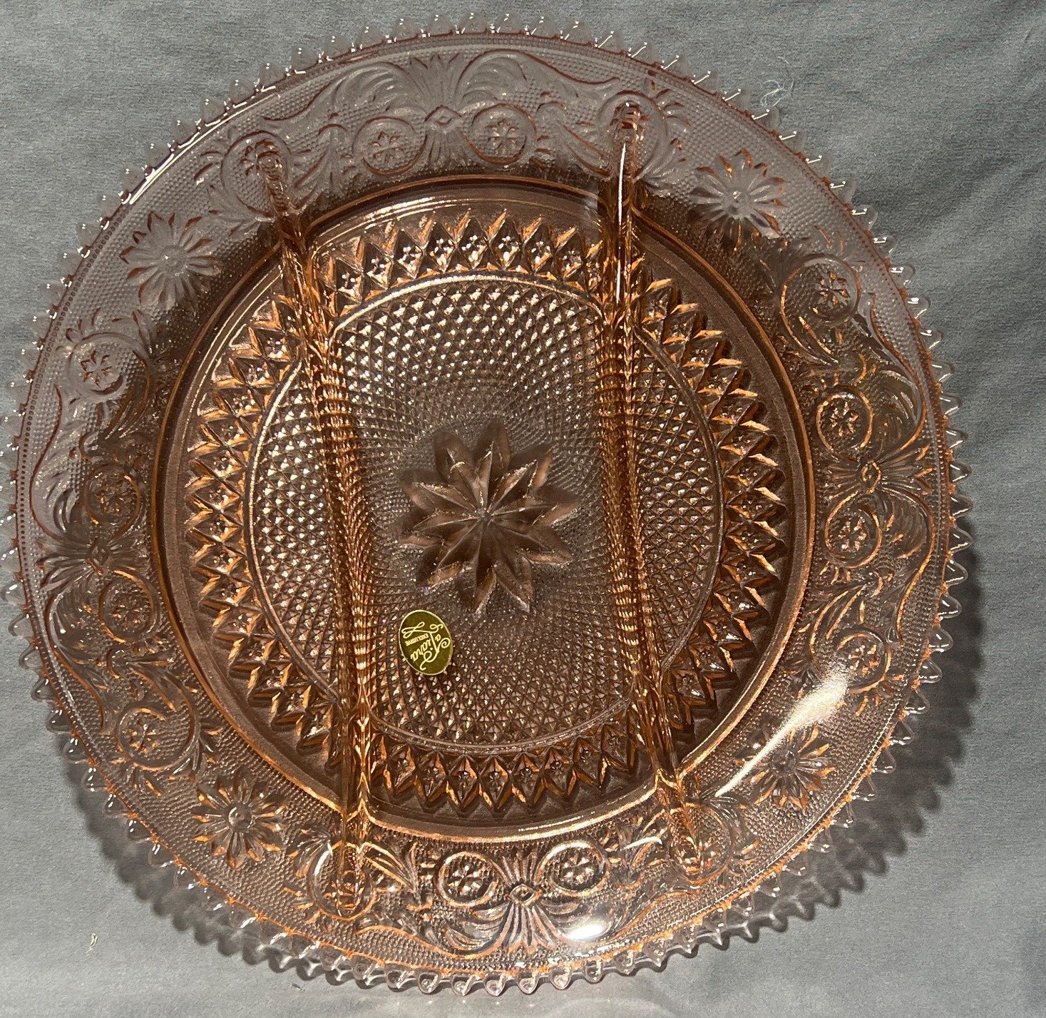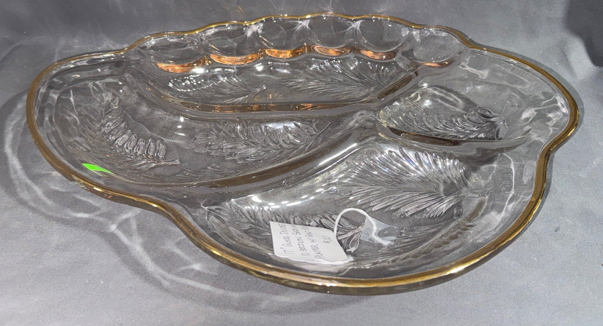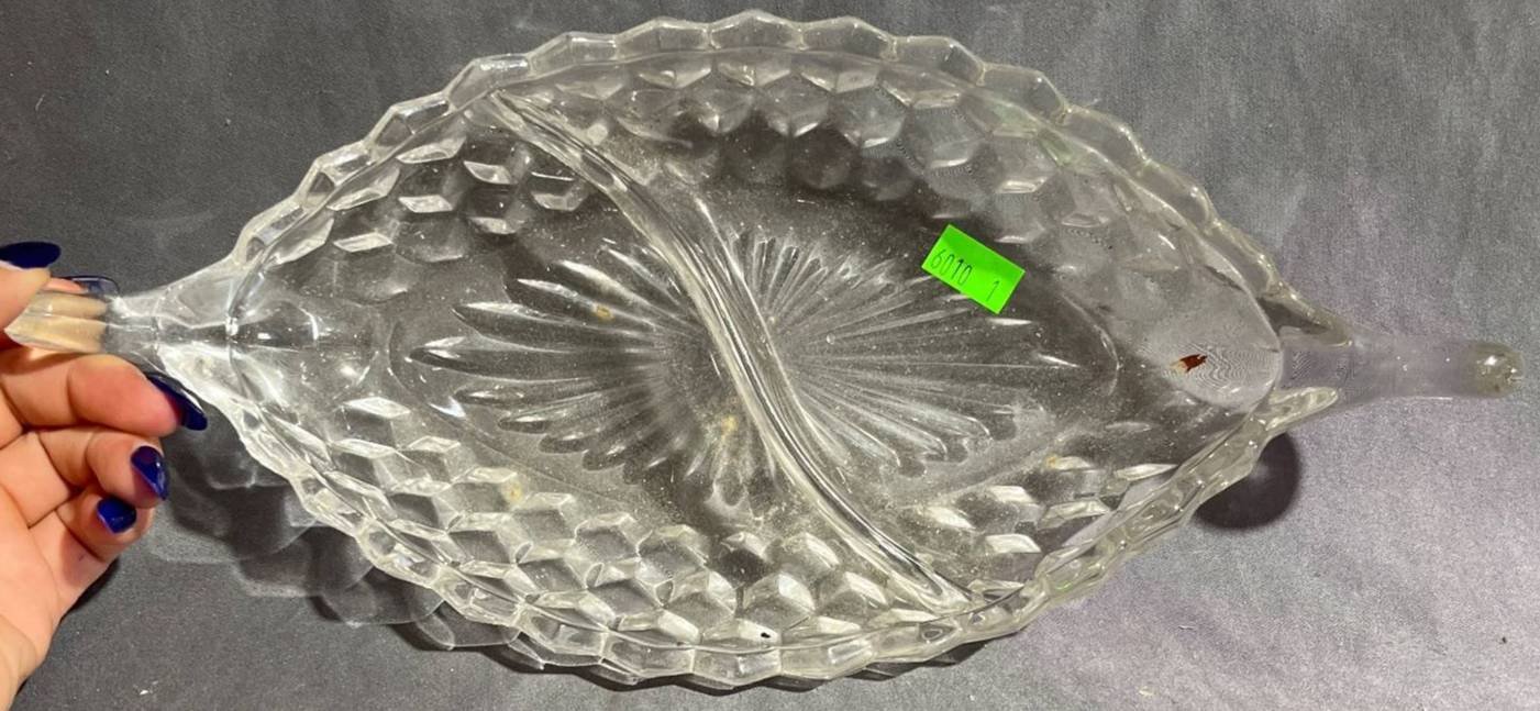 6010 Fostoria Pressed Glass Divided Leaf Dish with Sunburst Pattern and Handles 12”