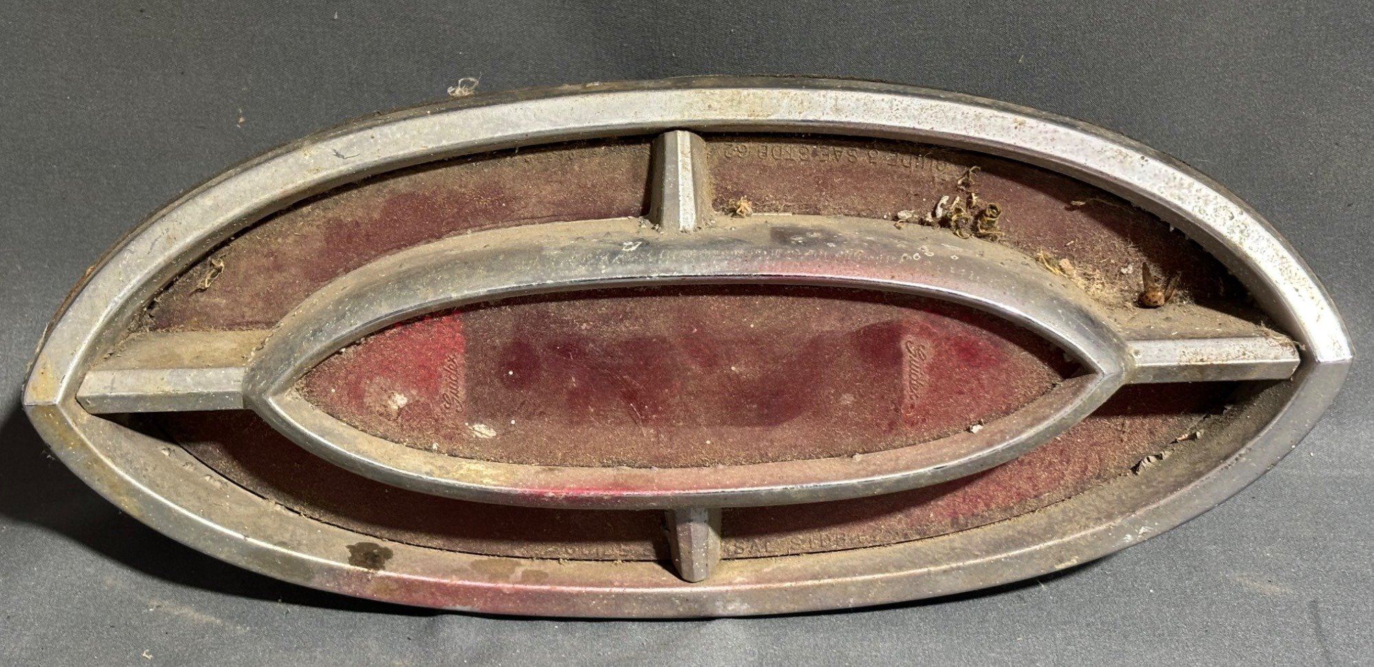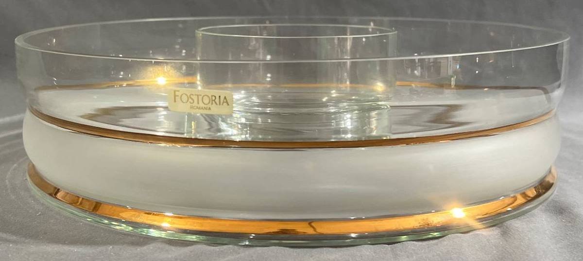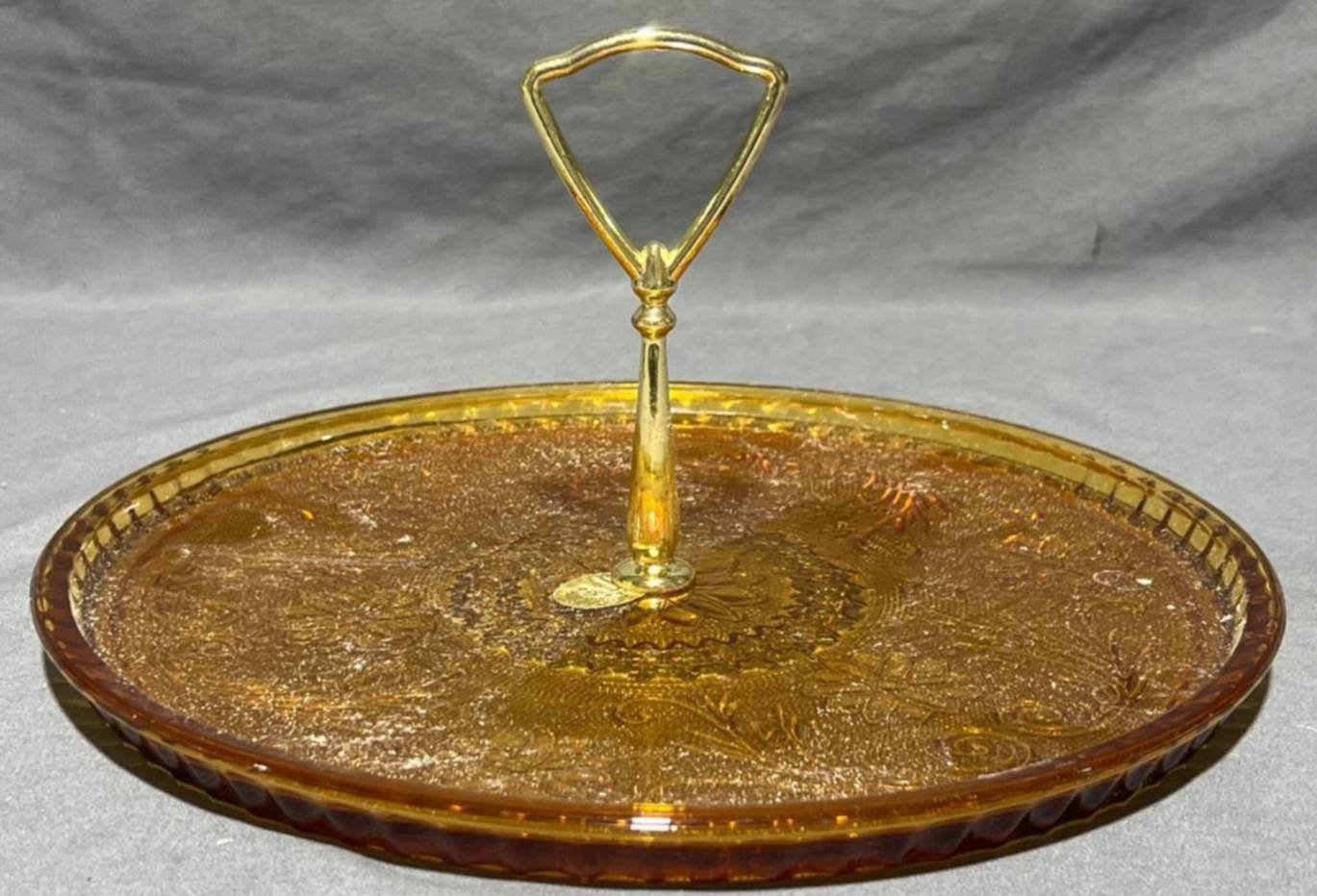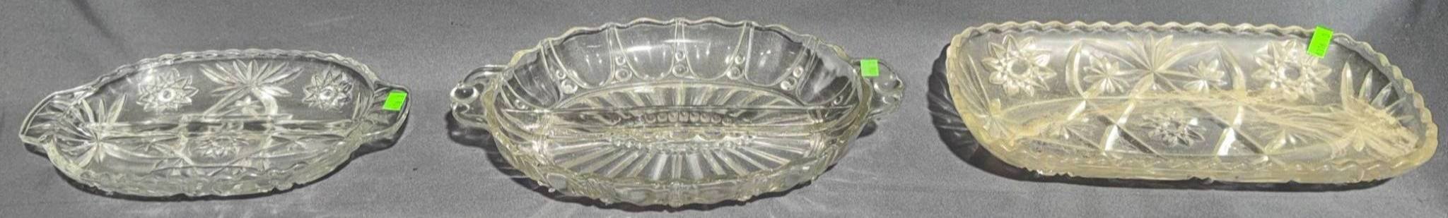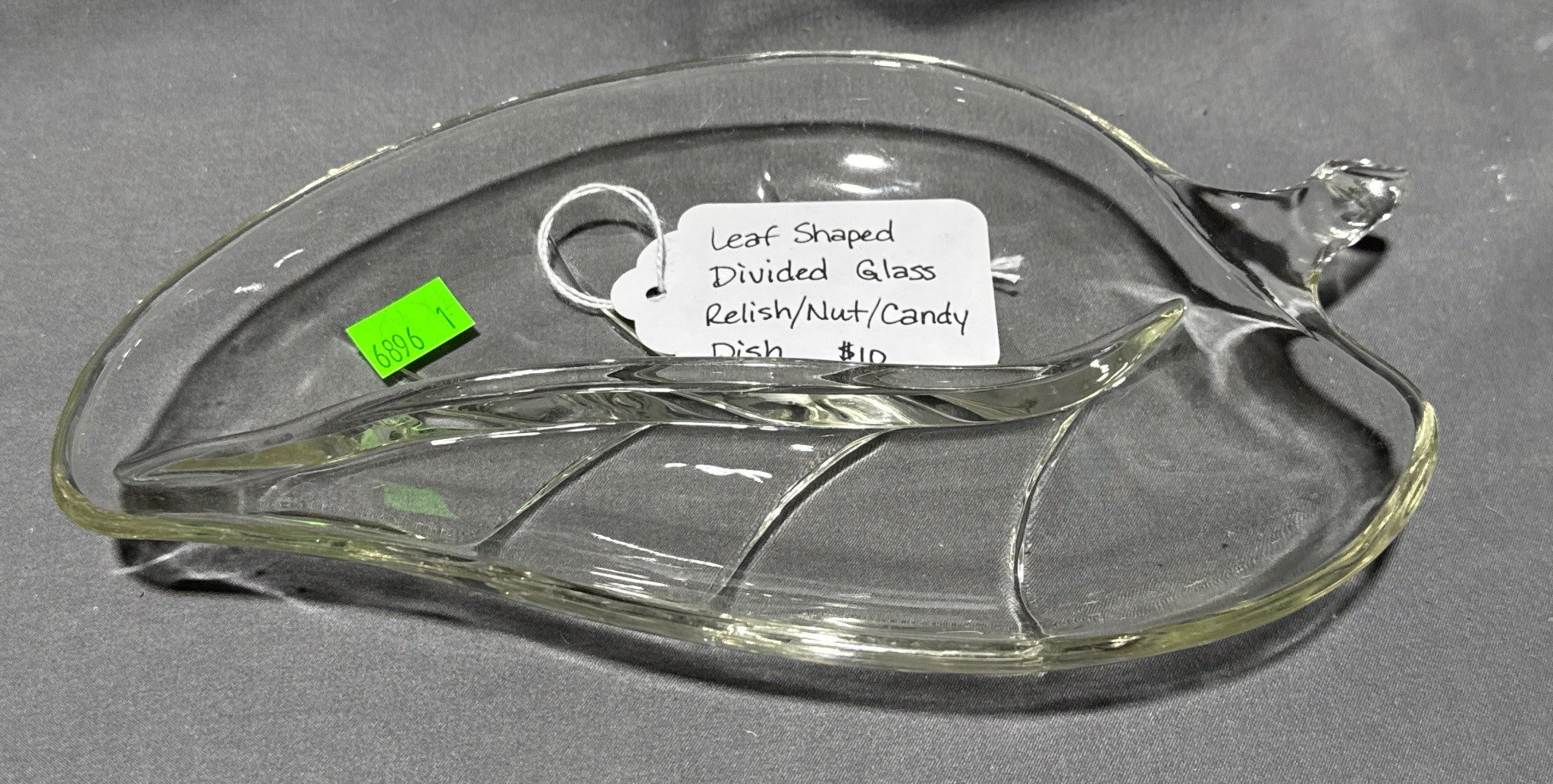 6010 Fostoria Pressed Glass Divided Leaf Dish with Sunburst Pattern and Handles 12”