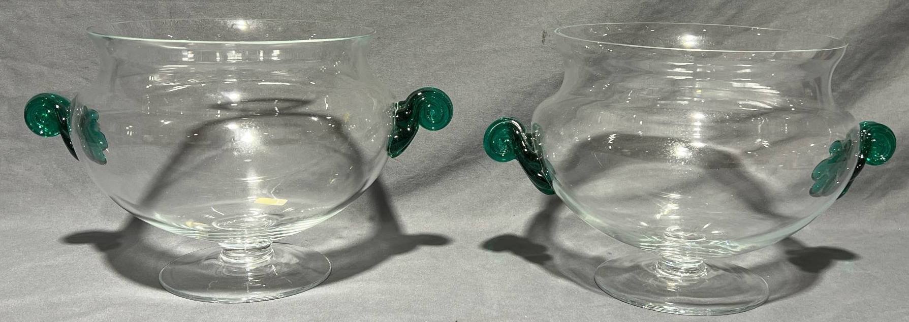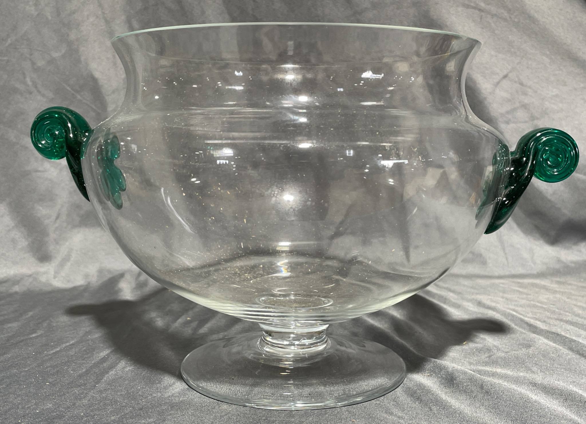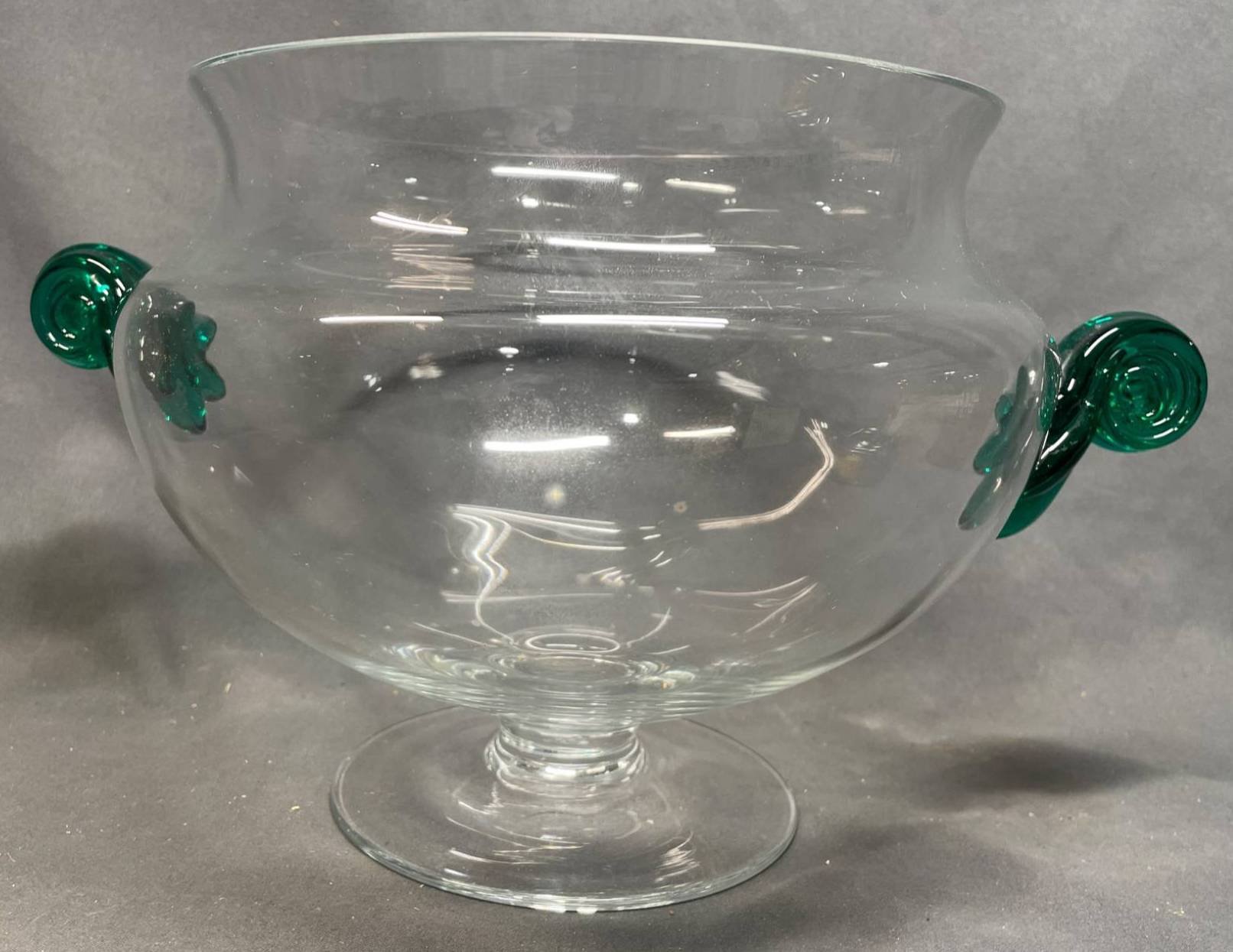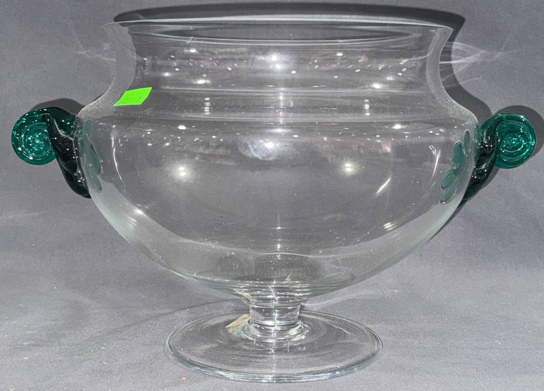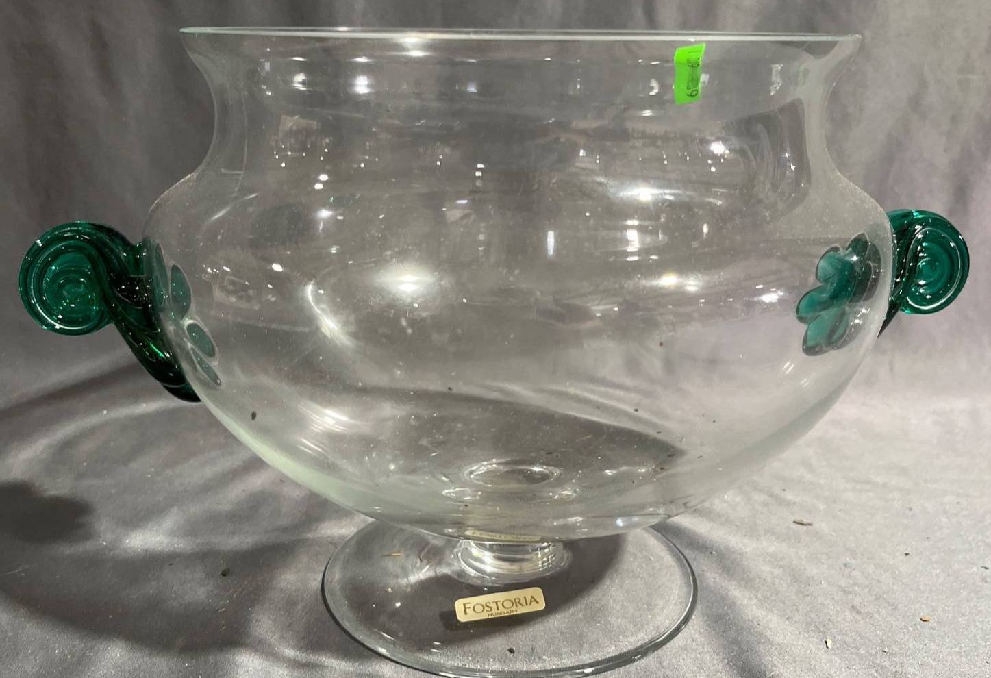 6012 Fostoria Hungary Clear Glass Footed Bowl with Green Applied Handles 8”