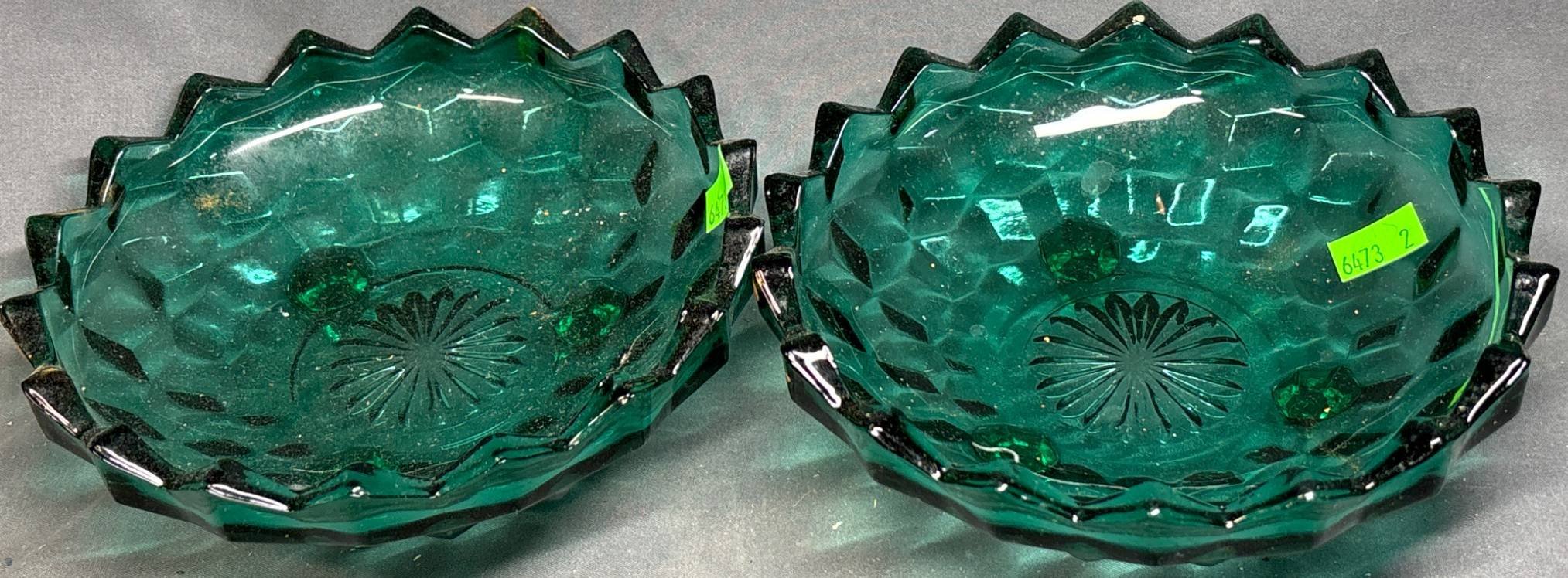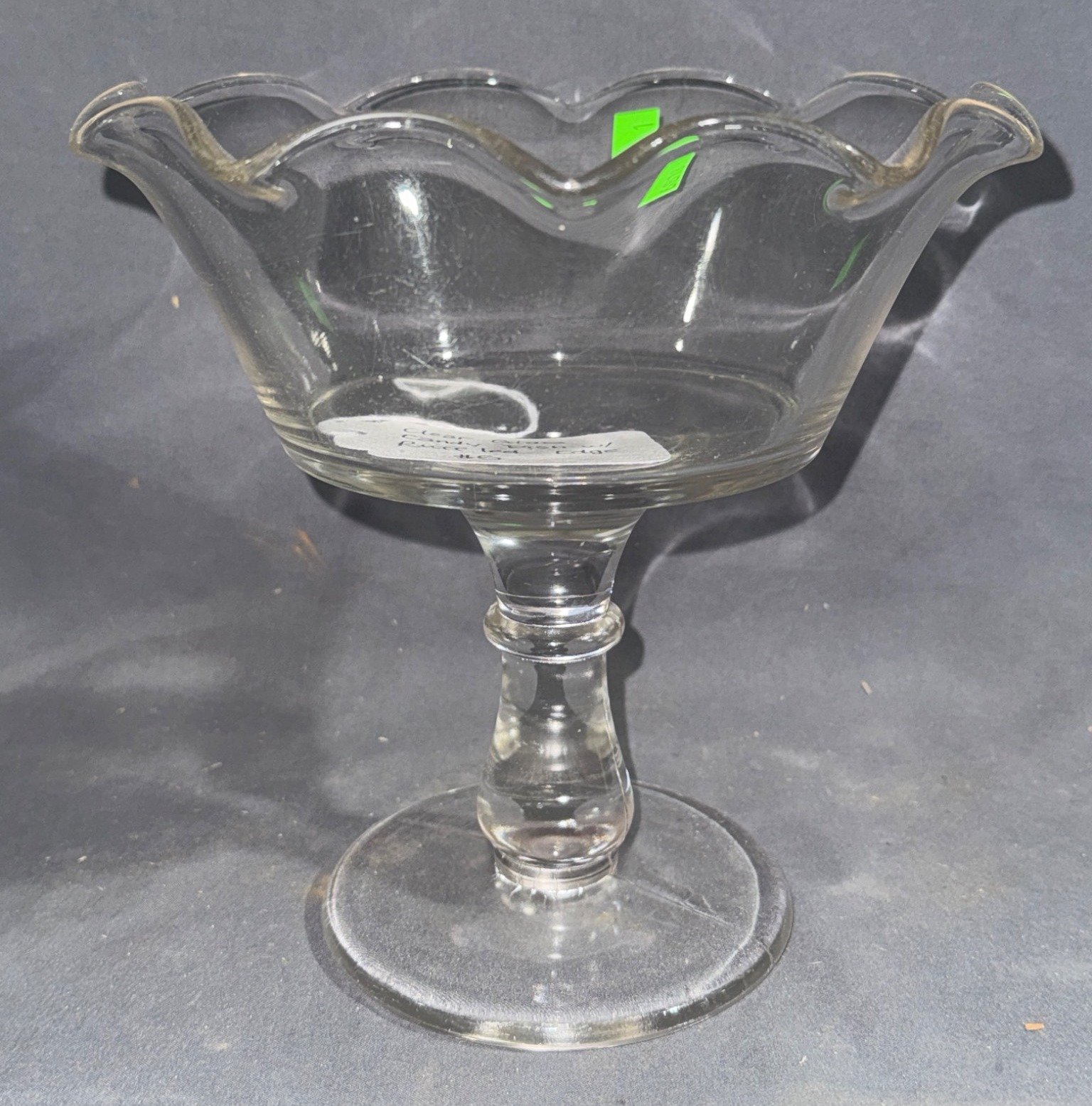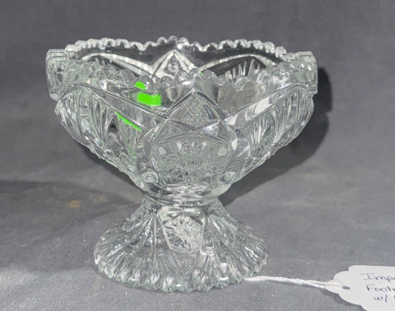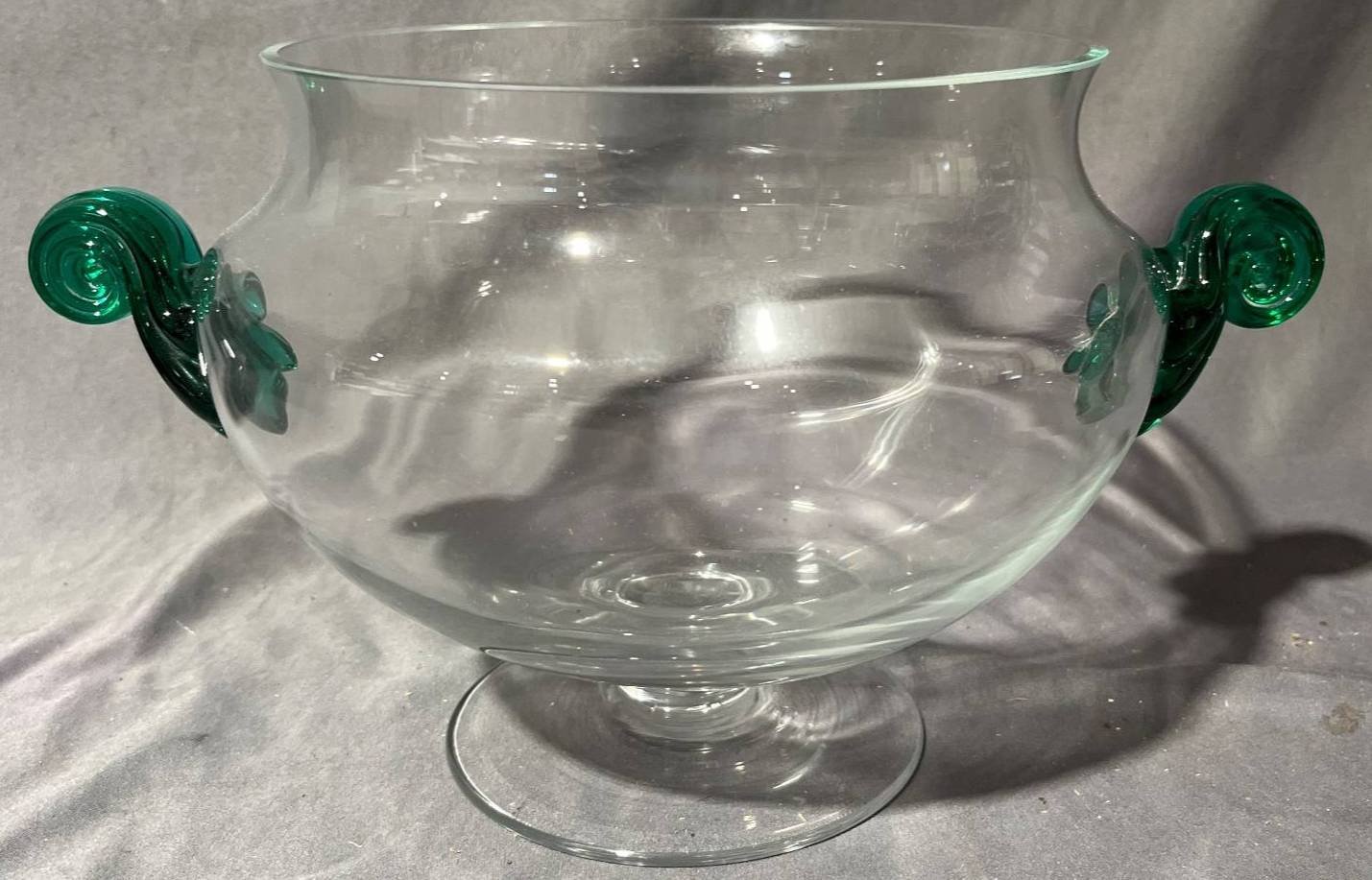 6012 Fostoria Hungary Clear Glass Footed Bowl with Green Applied Handles 8”