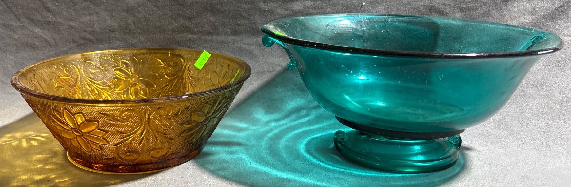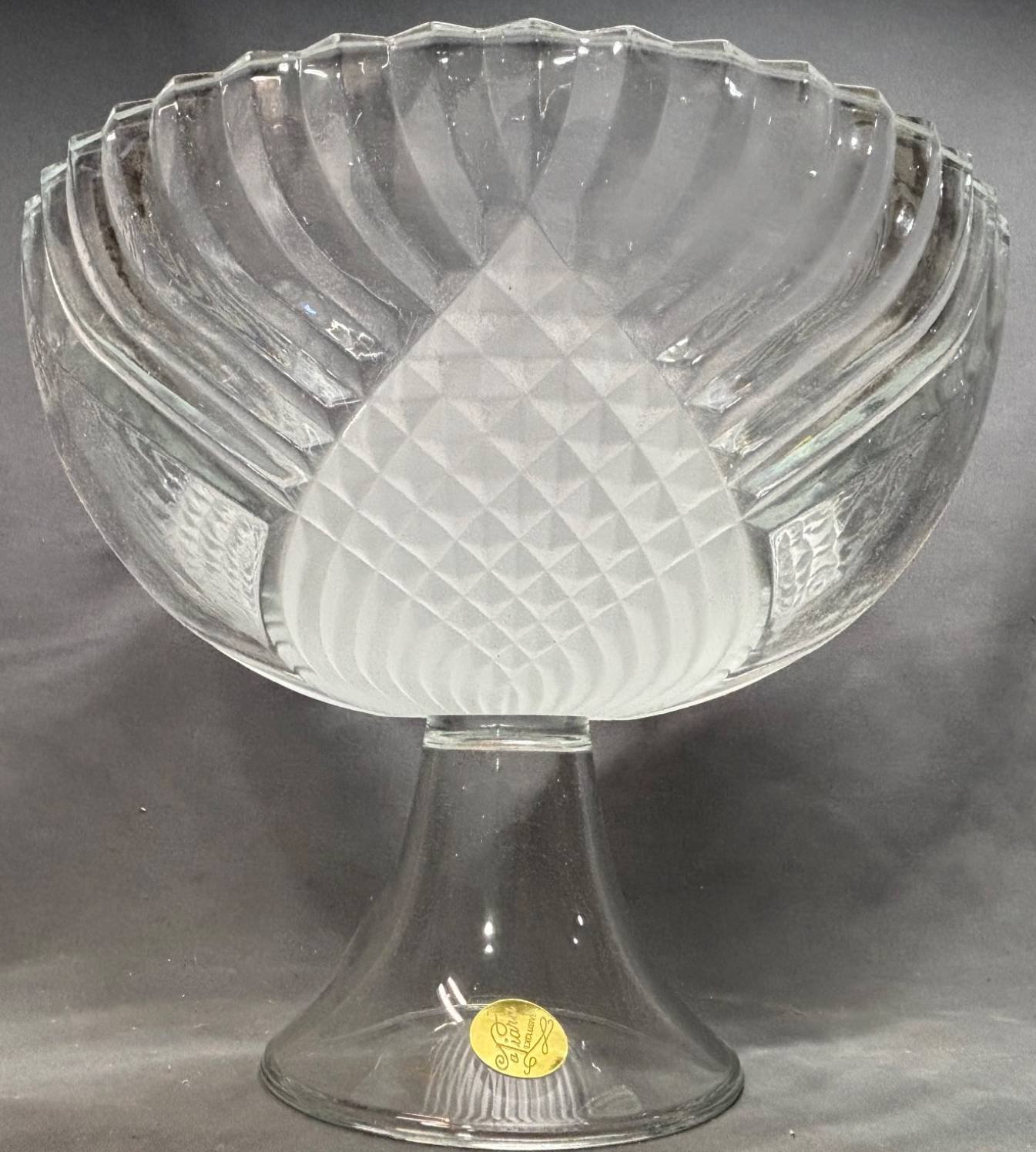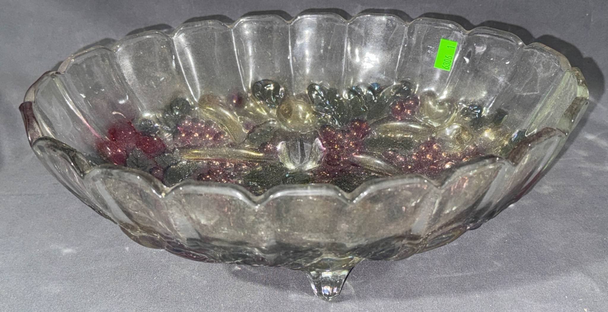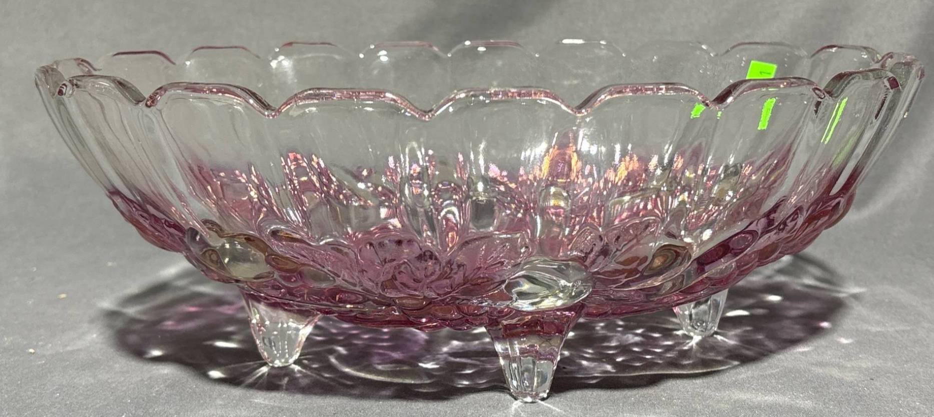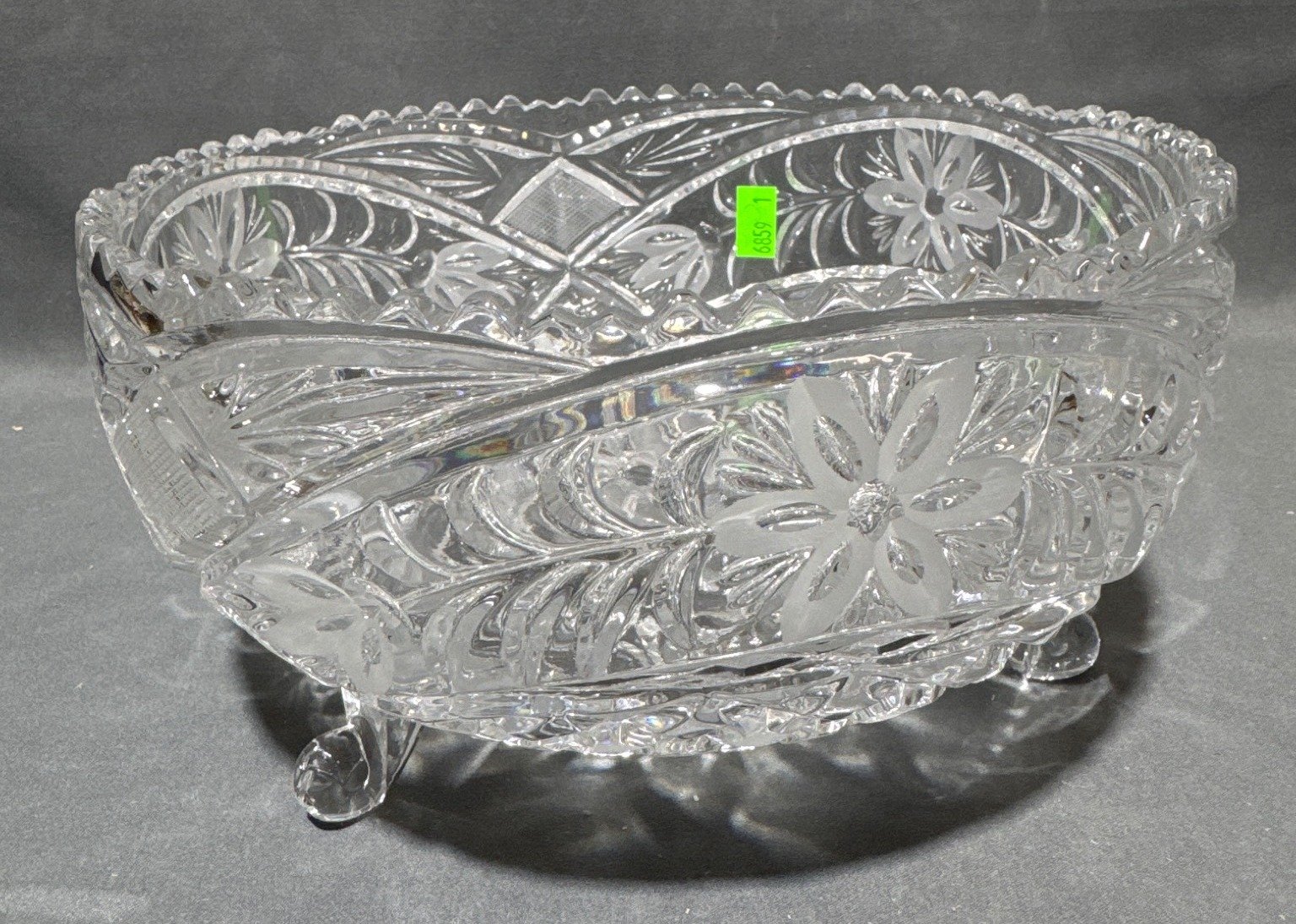 6012 Fostoria Hungary Clear Glass Footed Bowl with Green Applied Handles 8”