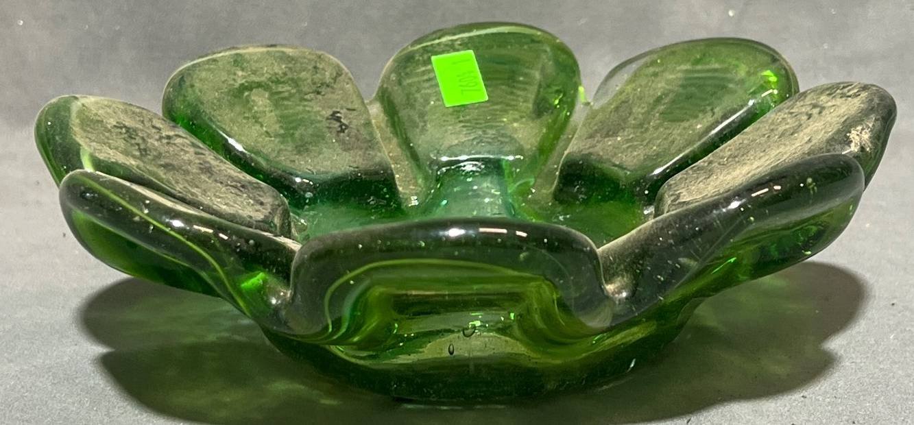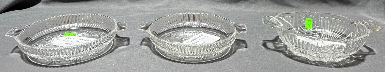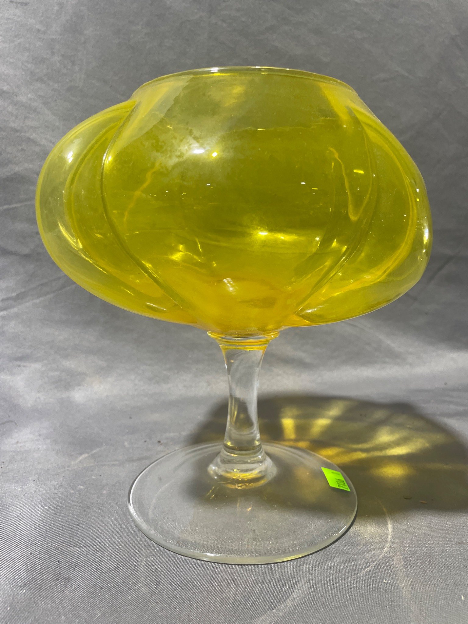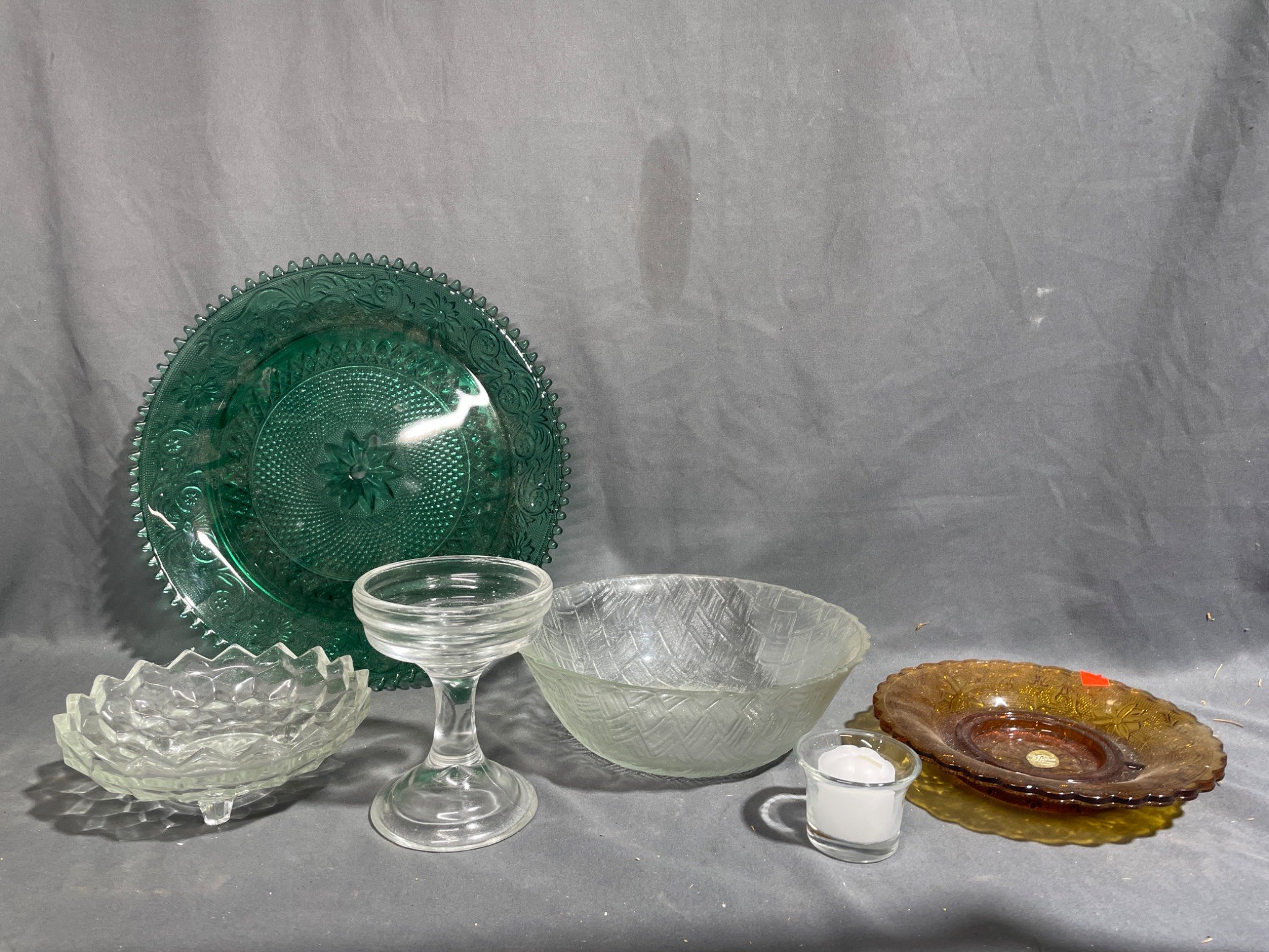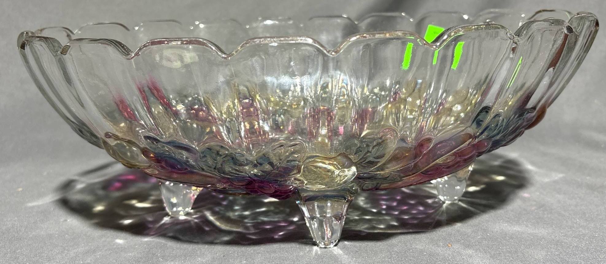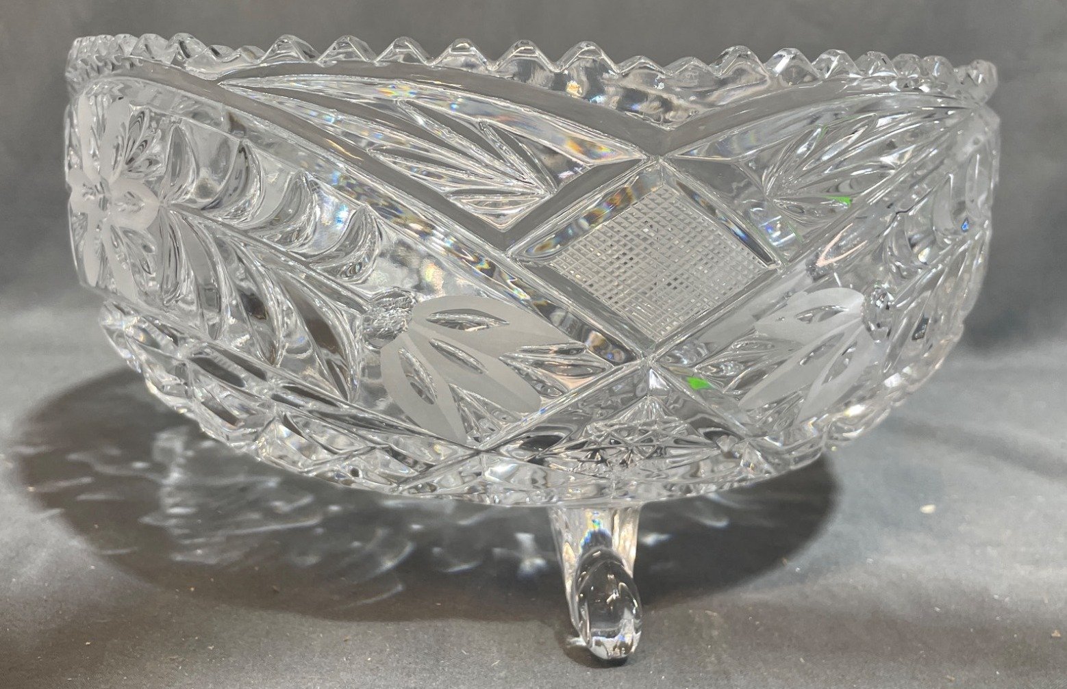 6012 Fostoria Hungary Clear Glass Footed Bowl with Green Applied Handles 8”
