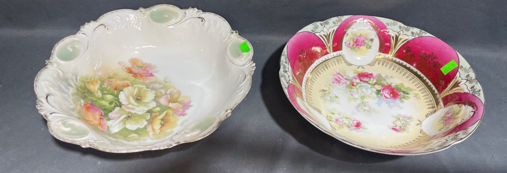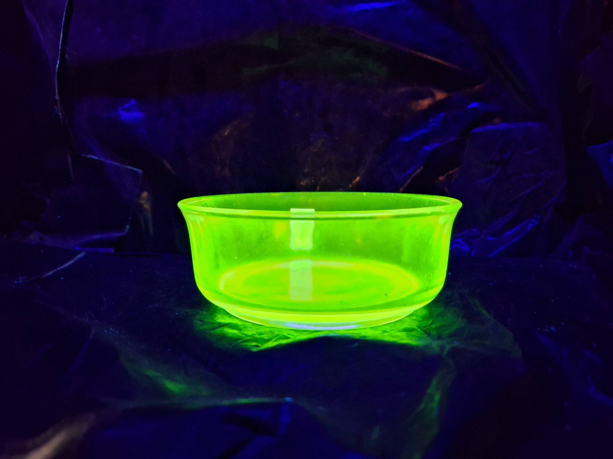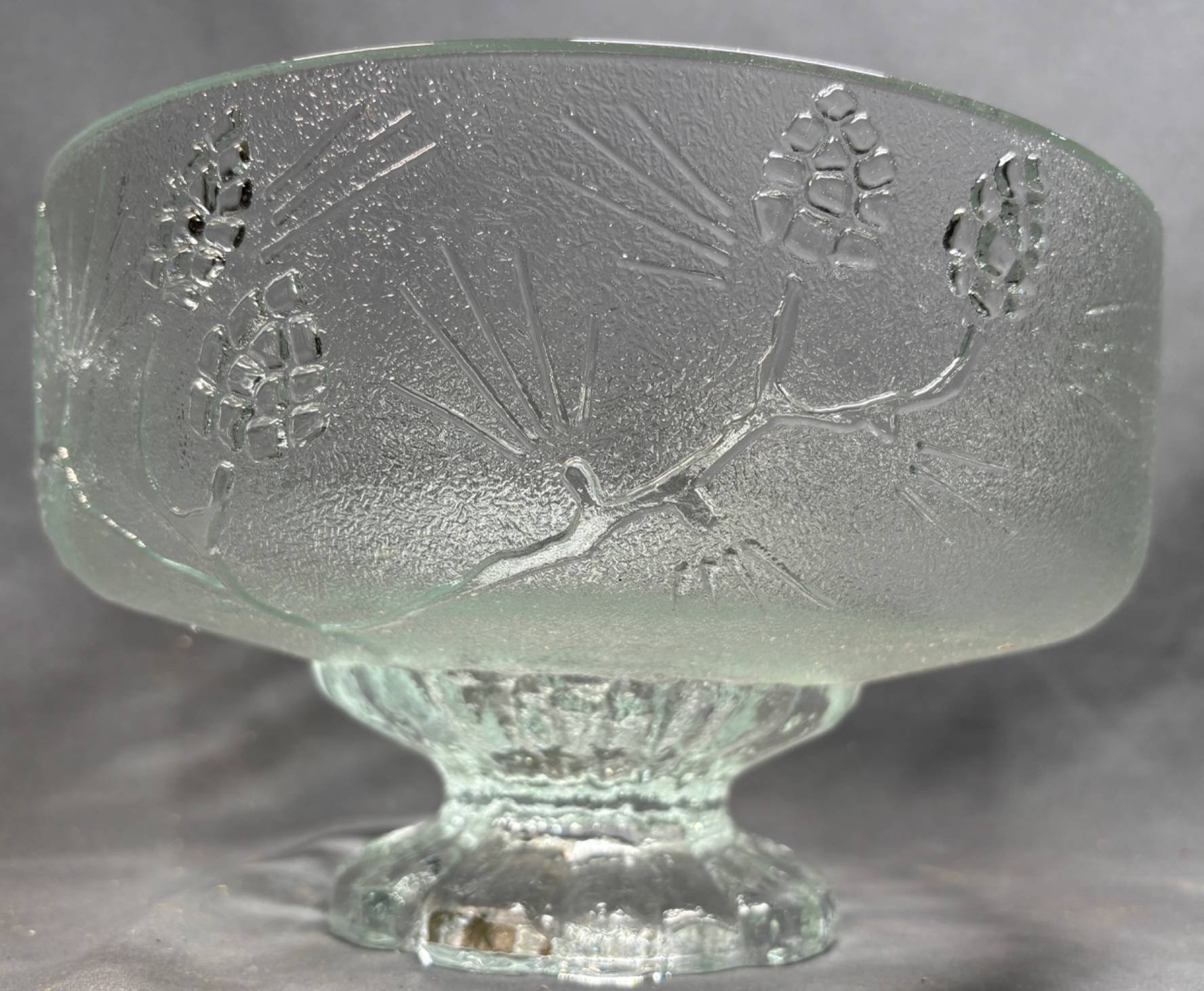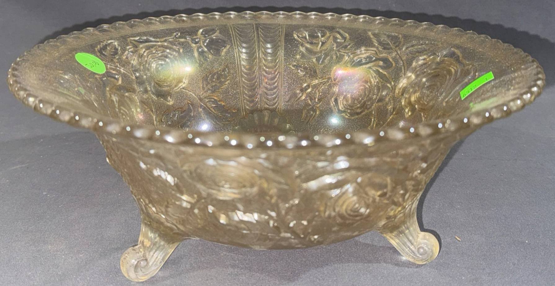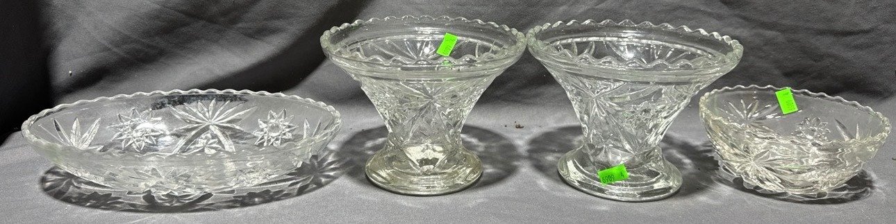 6012 Fostoria Hungary Clear Glass Footed Bowl with Green Applied Handles 8”