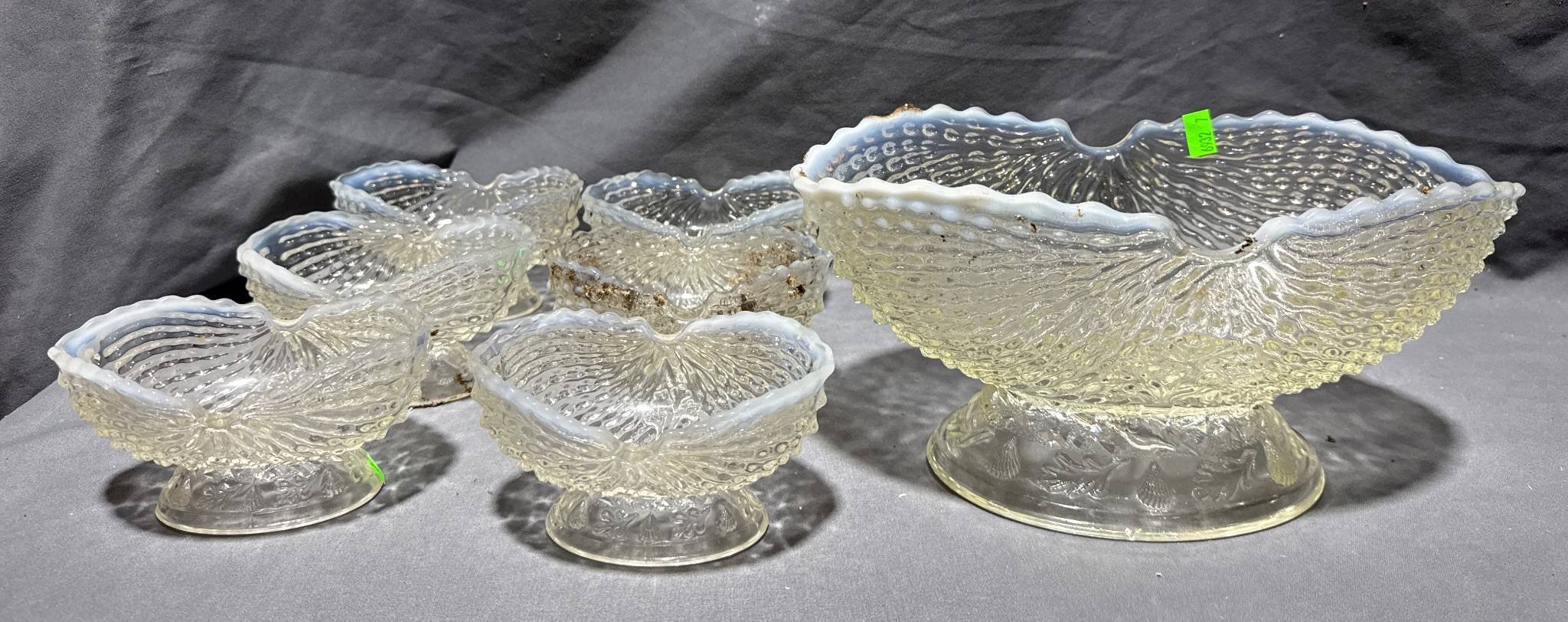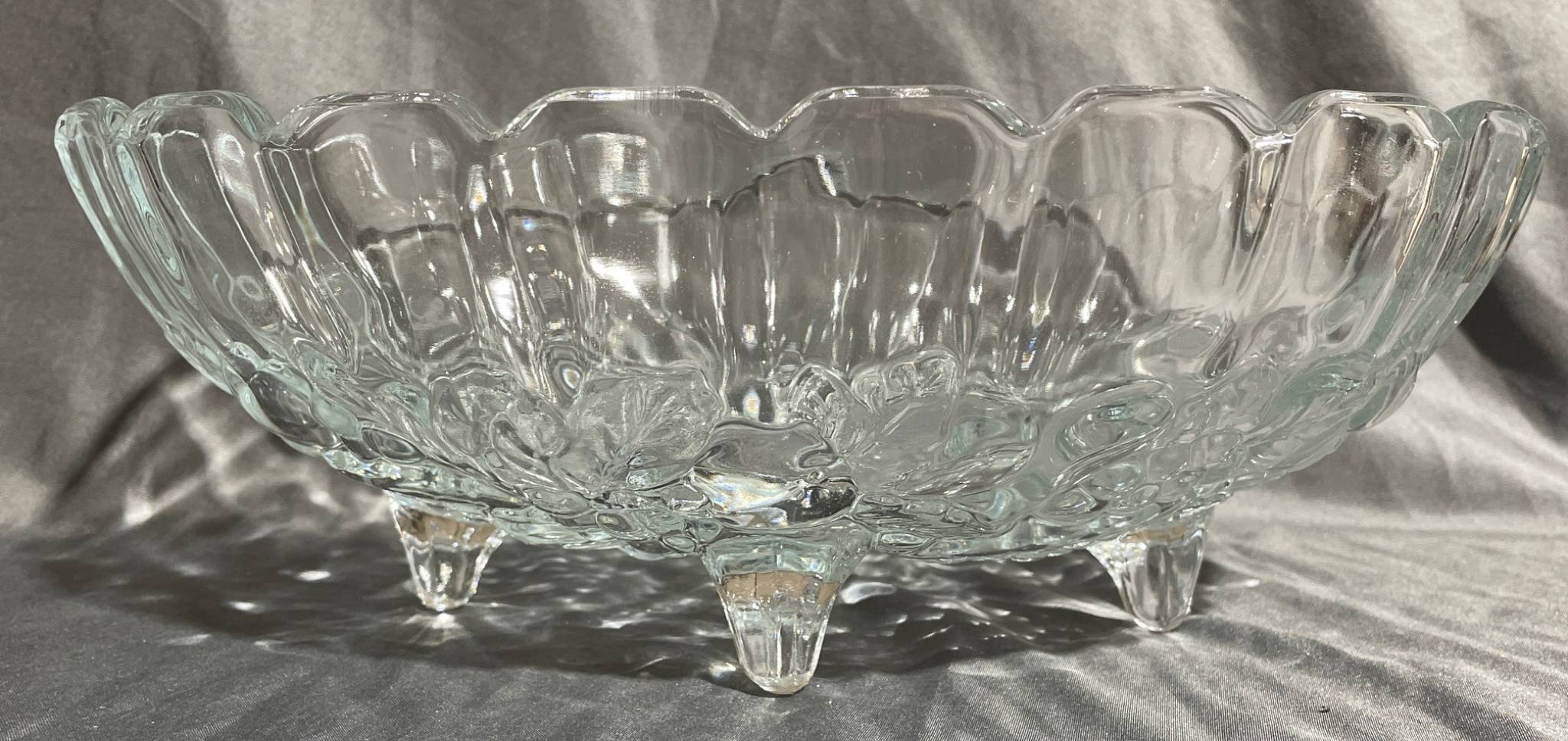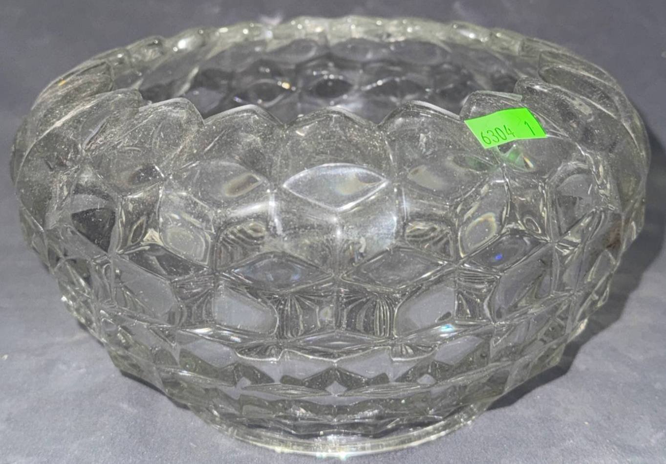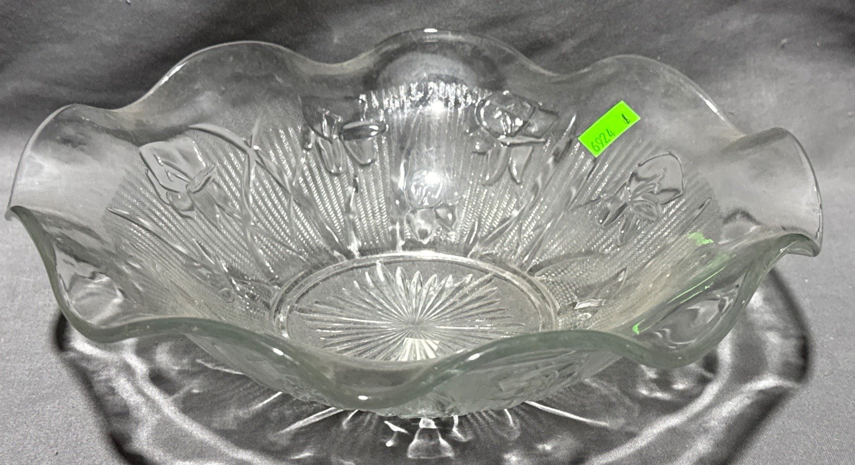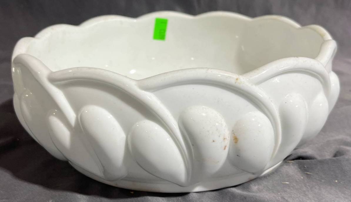 6013 White Pressed Glass Bowl with Scalloped and Embossed Design 8.5”
