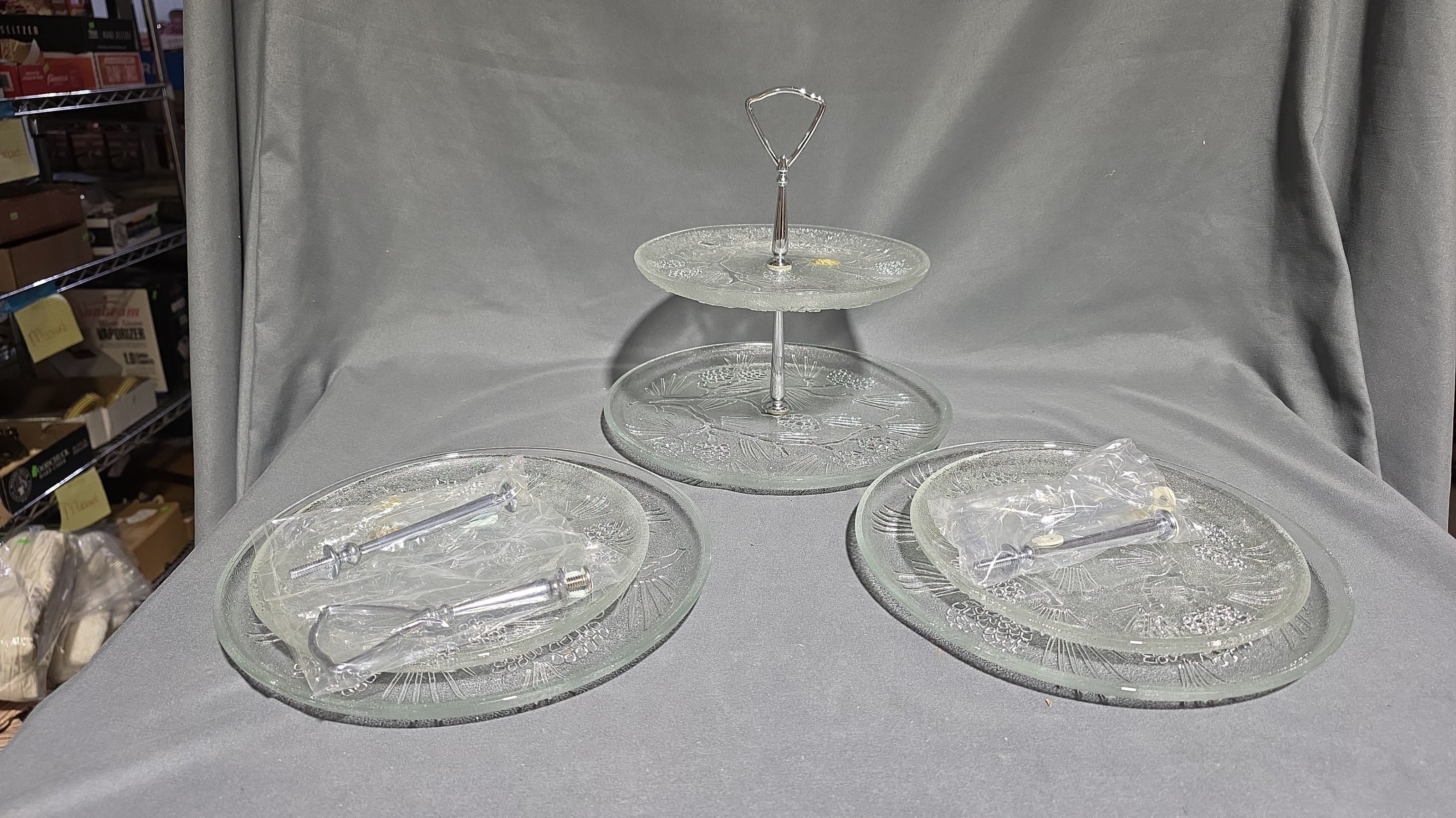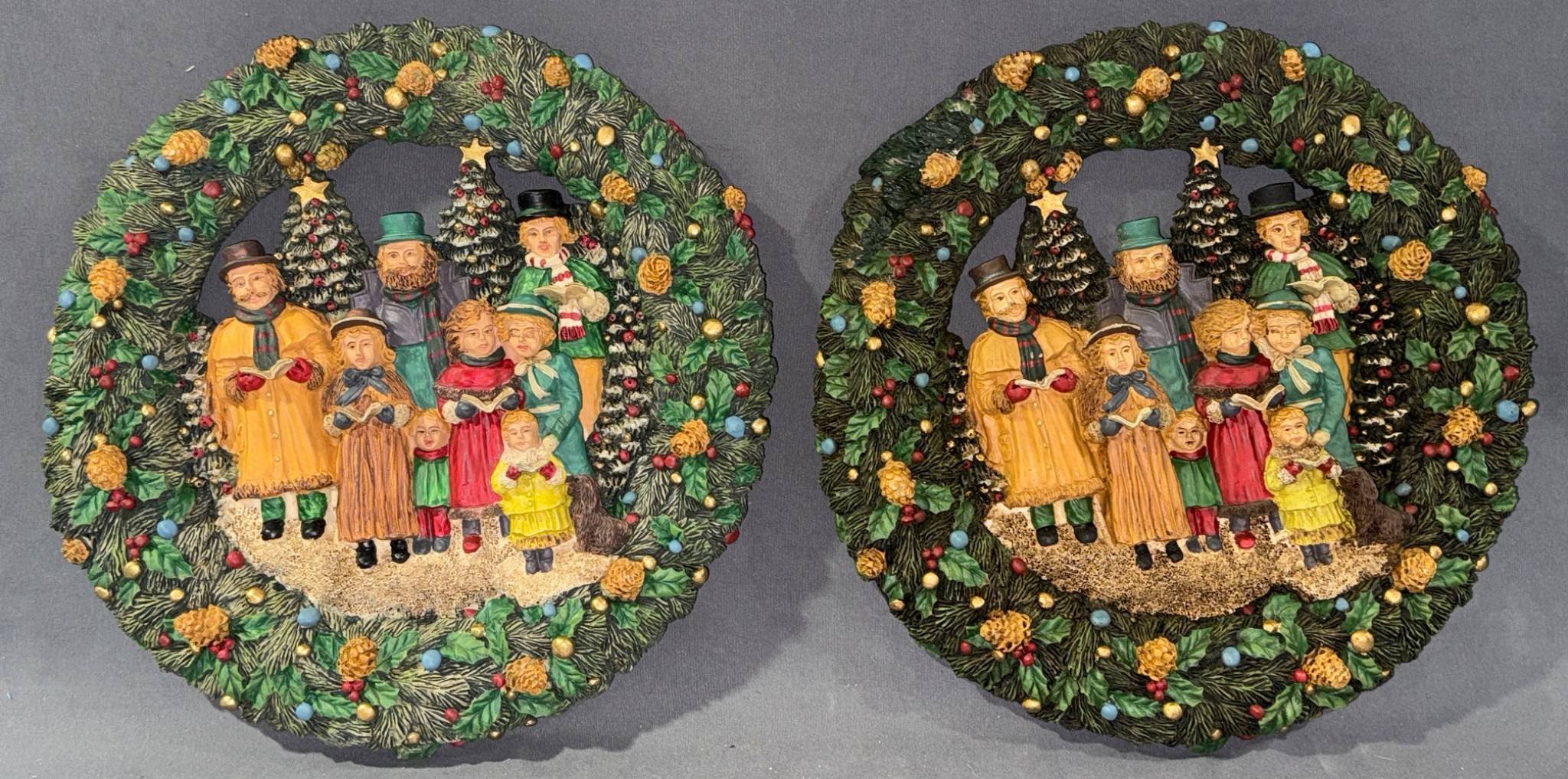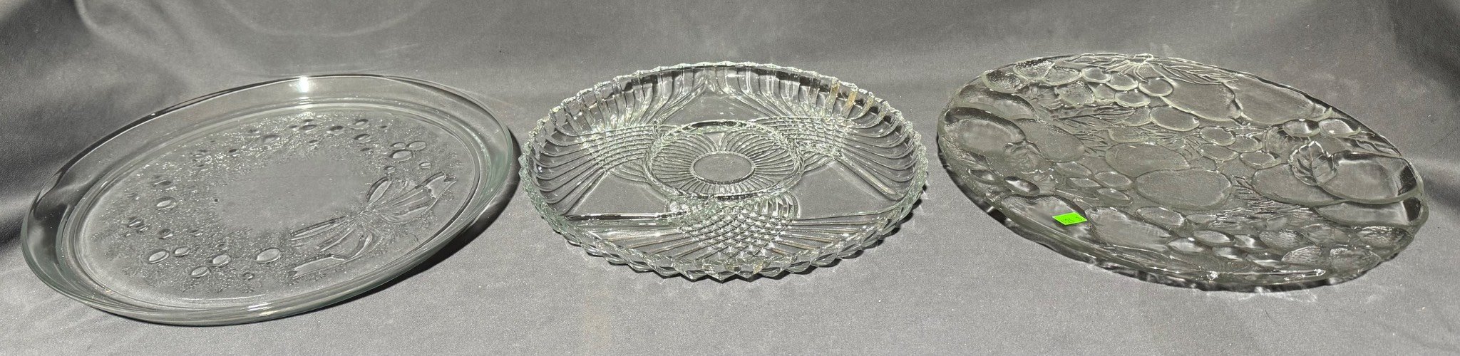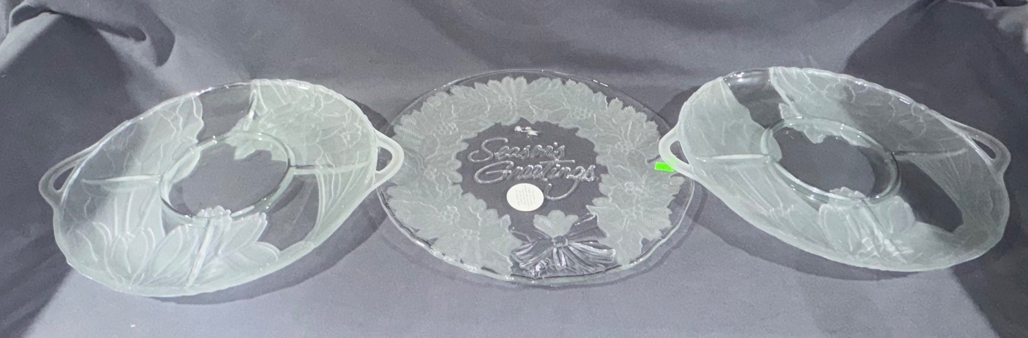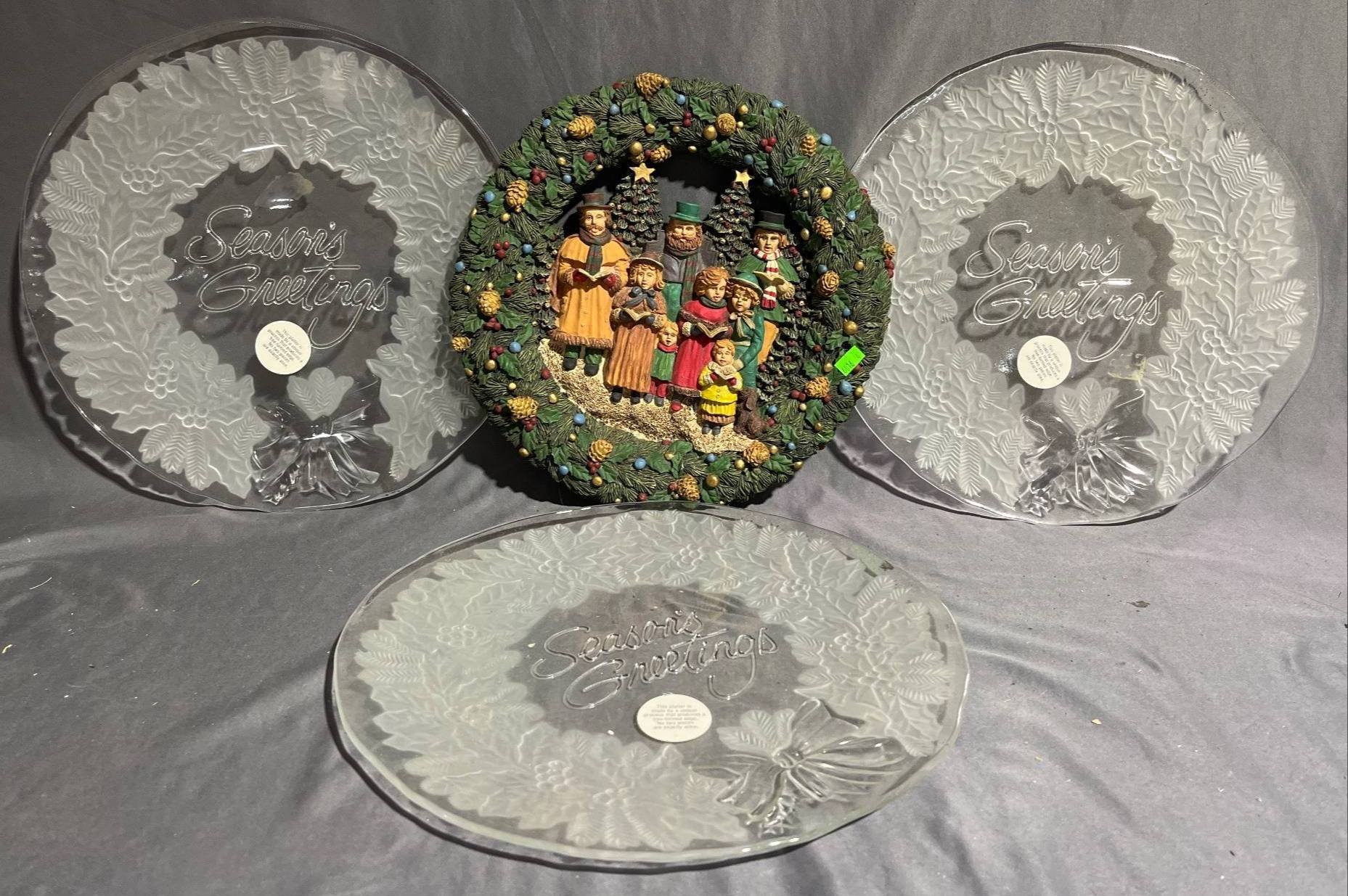 6016 3 Etched Glass Plates with ‘Season’s Greetings’ Design 14” and Resin Holiday Wreath 12”