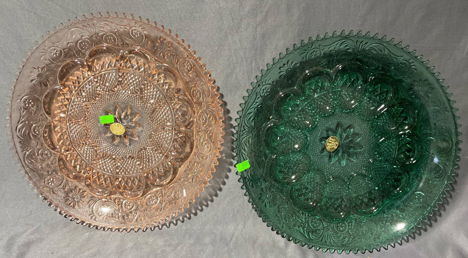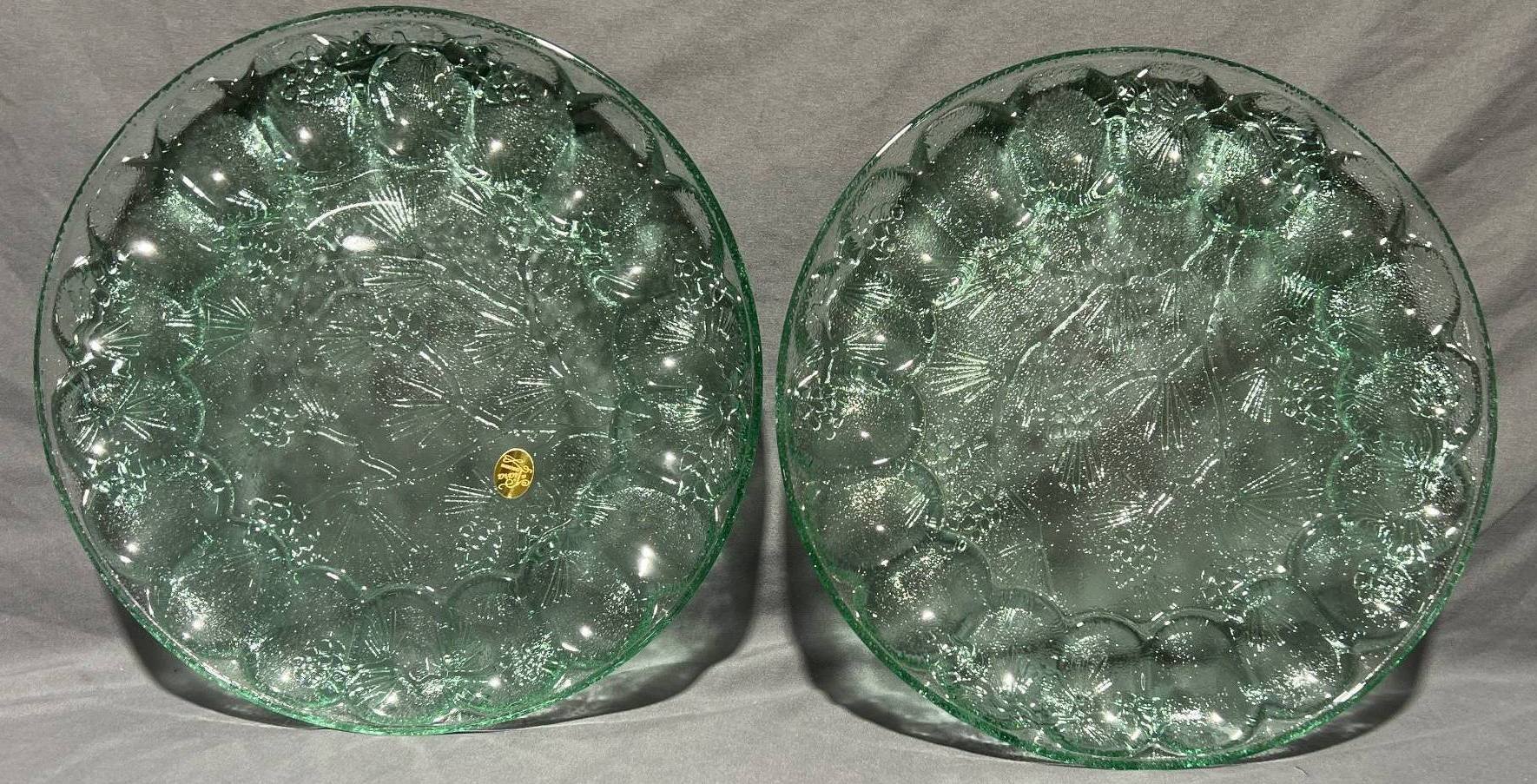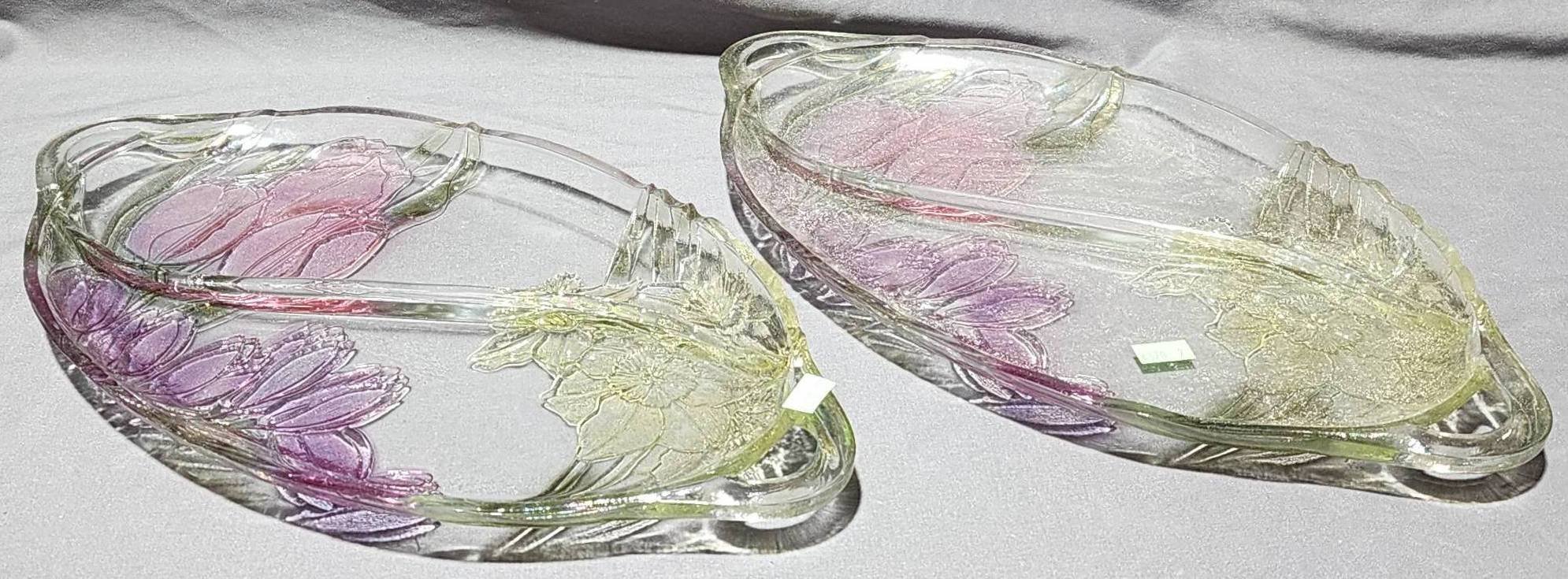 6022 2- Colored Glass Plates with Etched Floral Design by Arcoroc Exclusive 12”