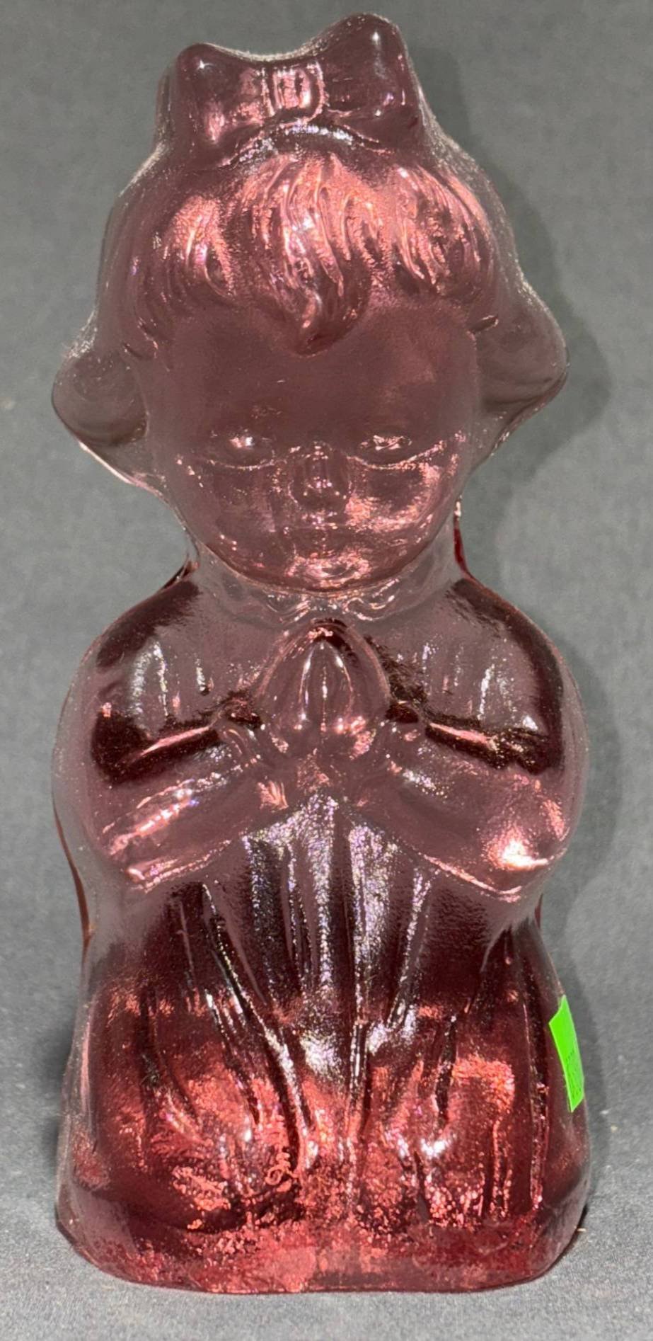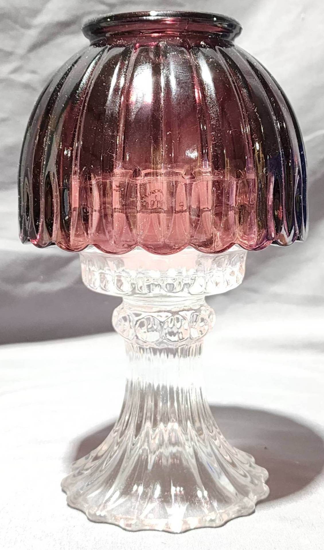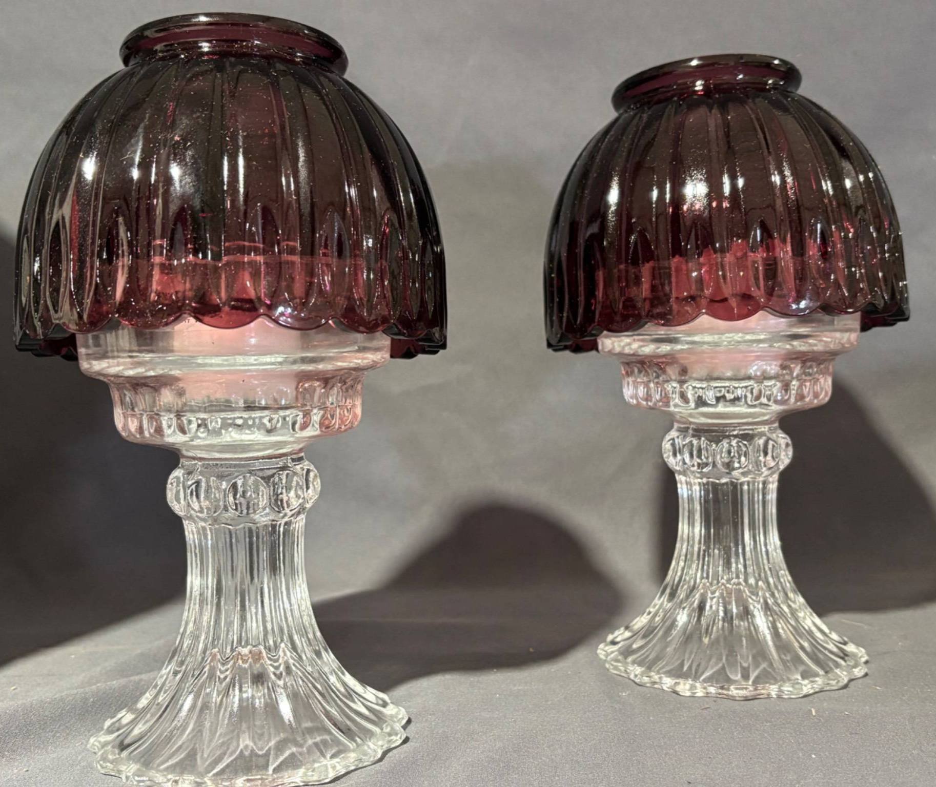 6034 2 – L.E. Smith Glass Fairy Lamps with Plum Tops 8”