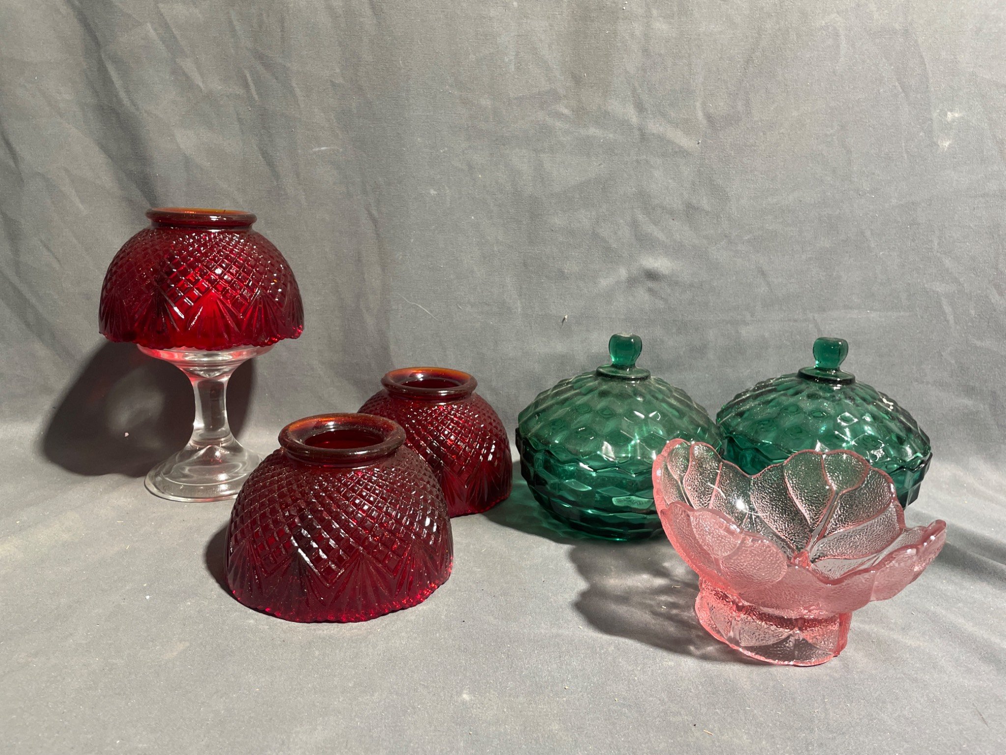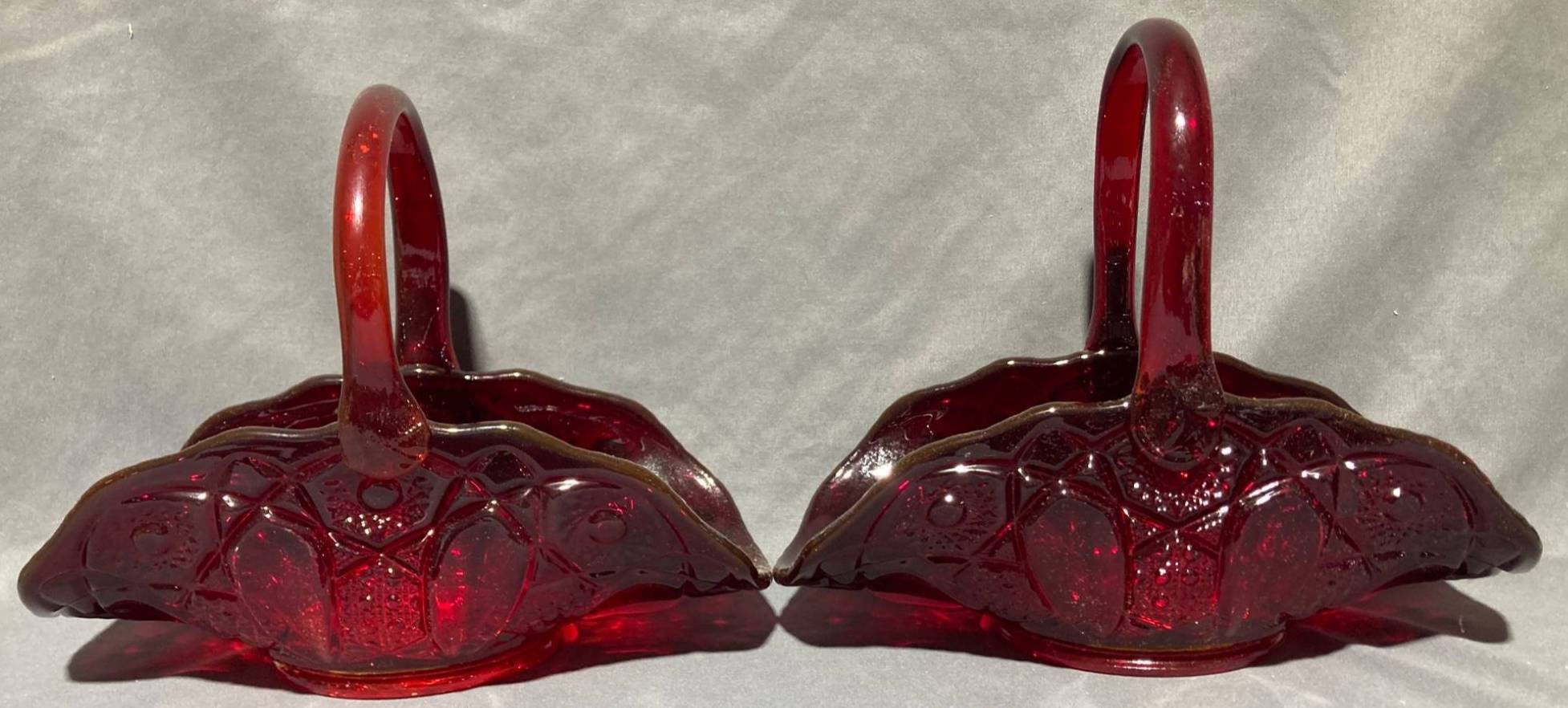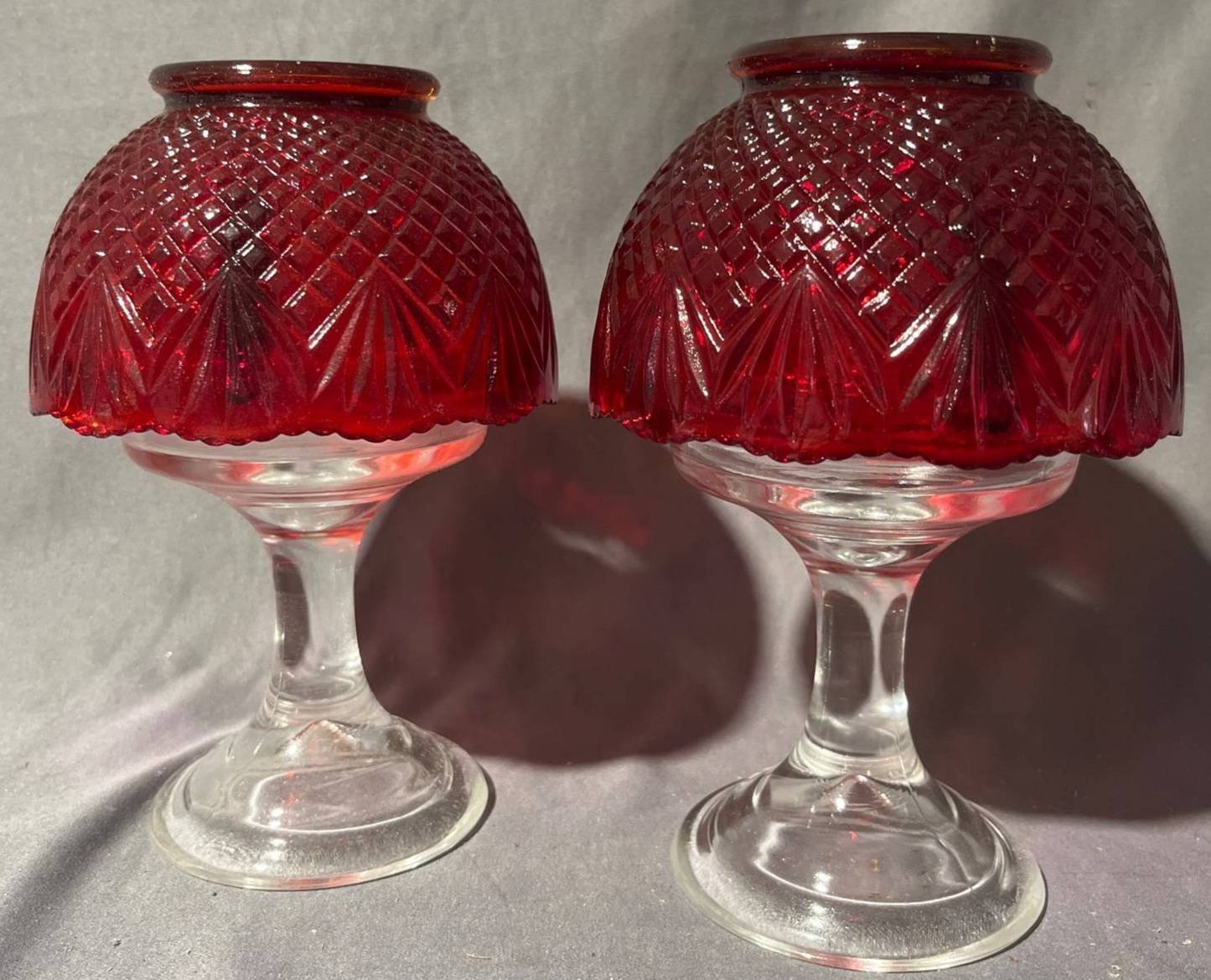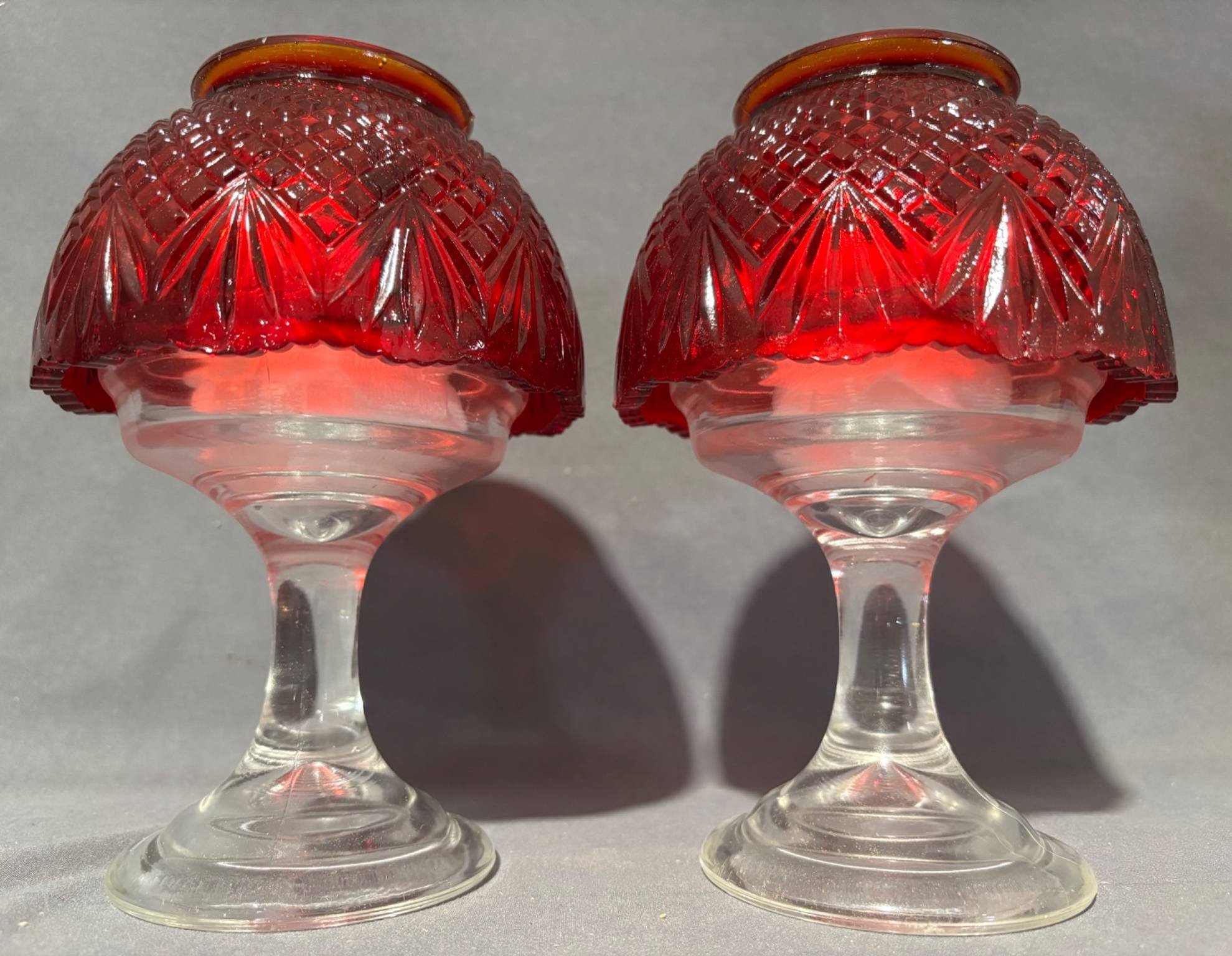 6036 2 – L.E. Smith Pressed Glass Fairy Lamps with Ruby Domed Shades 8” Tall