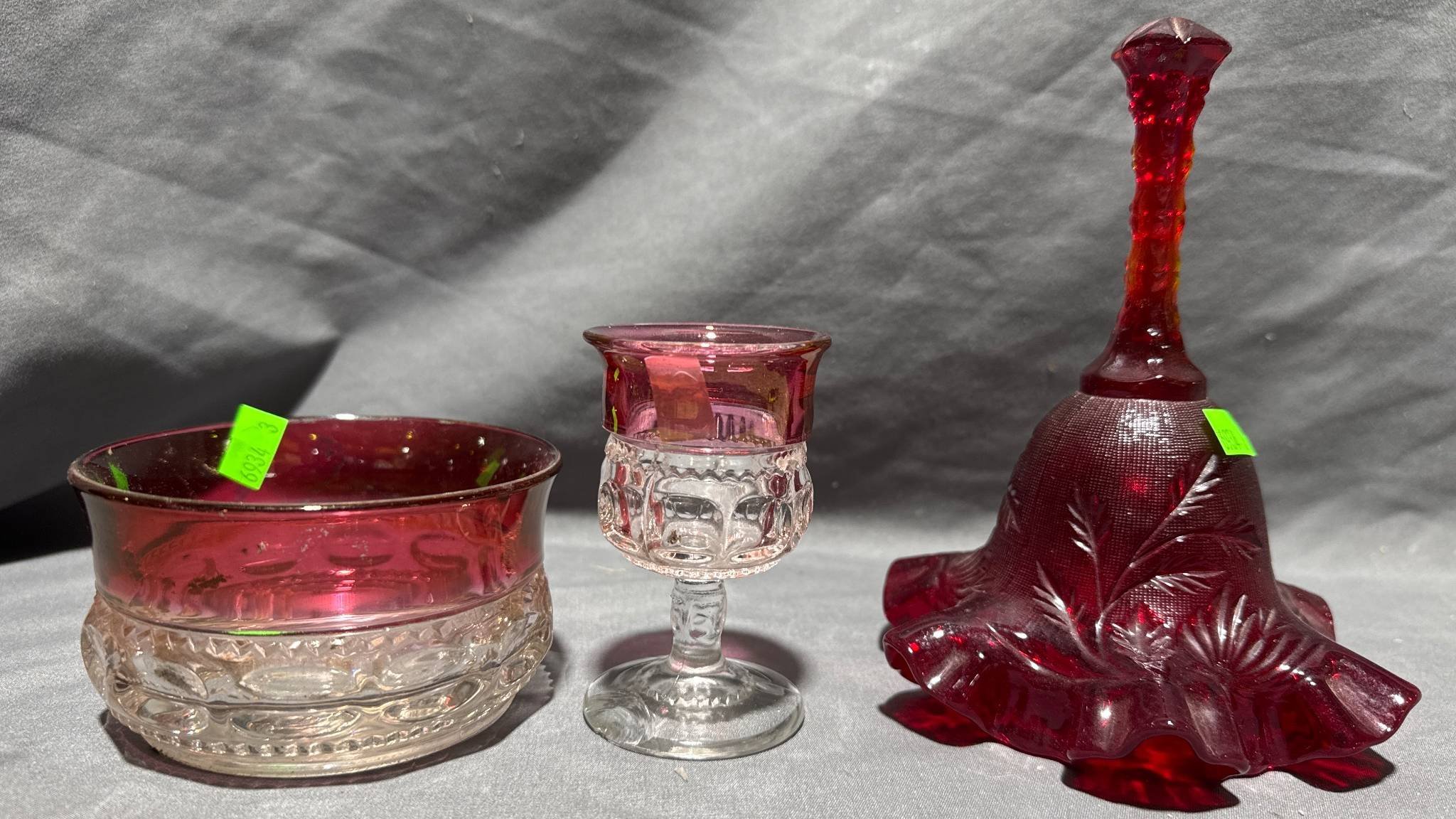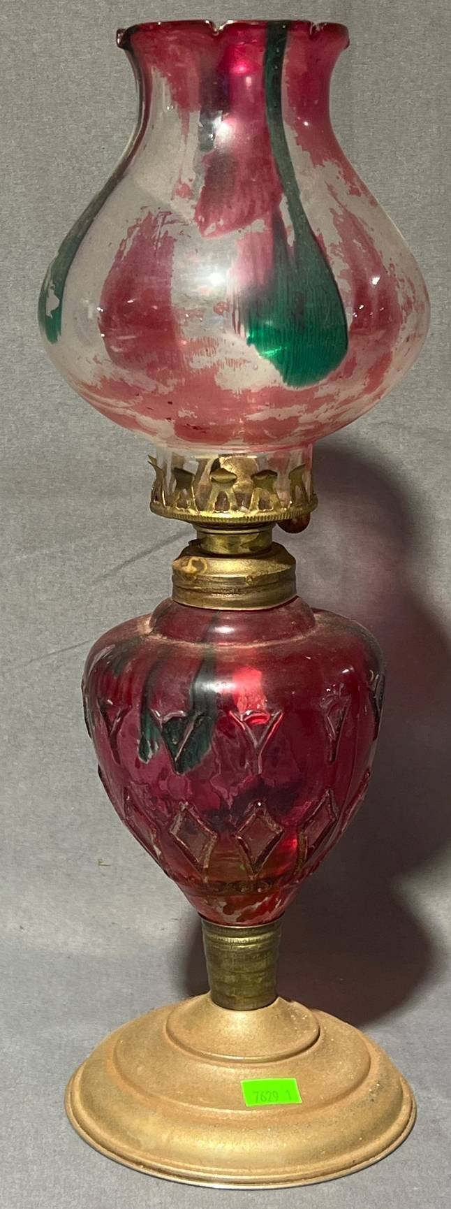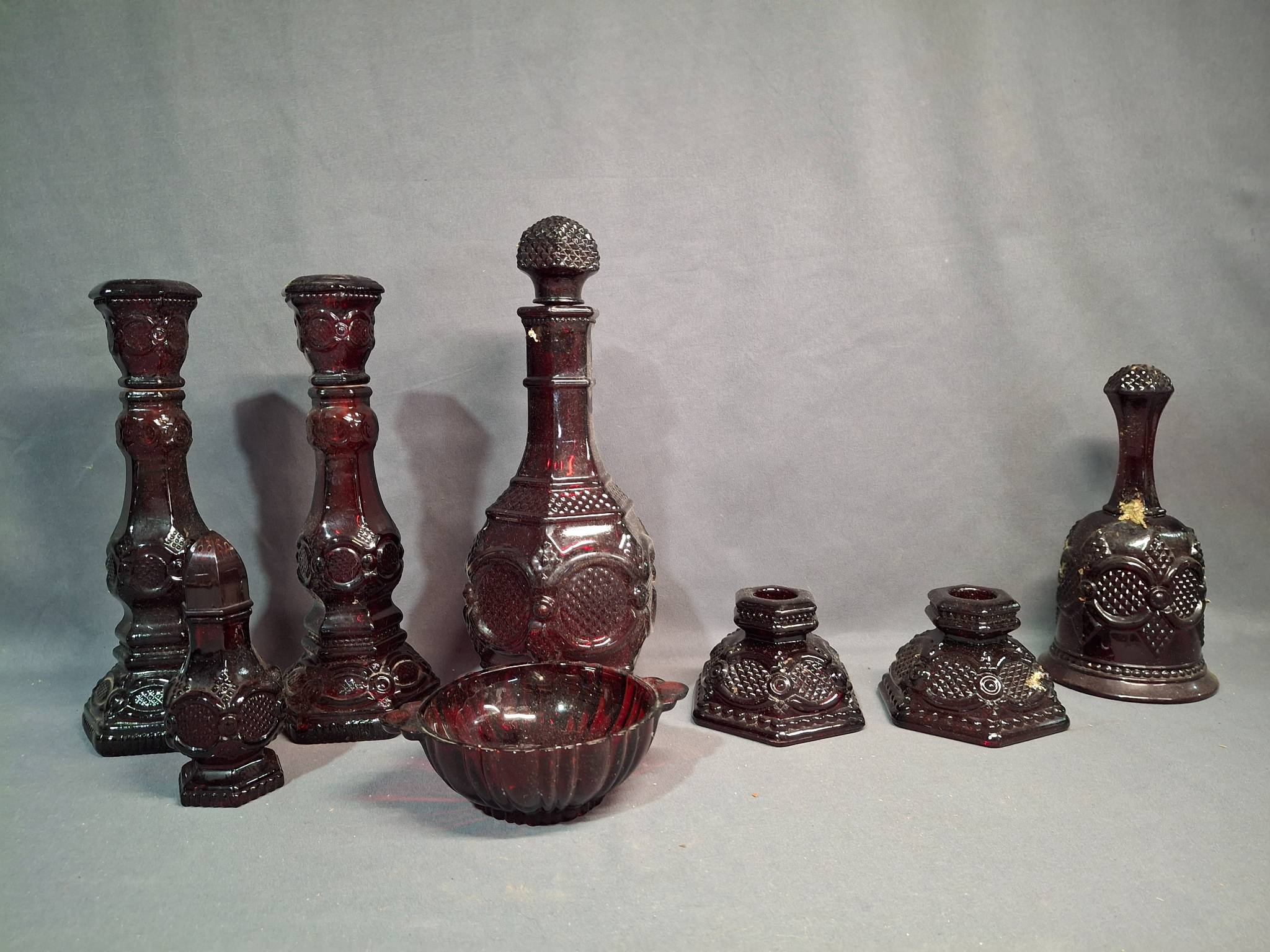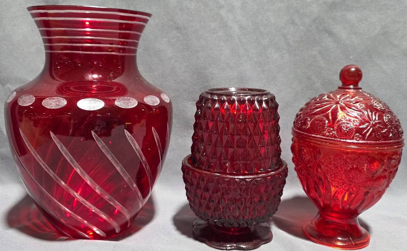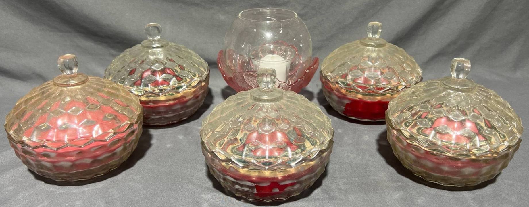 6036 2 – L.E. Smith Pressed Glass Fairy Lamps with Ruby Domed Shades 8” Tall
