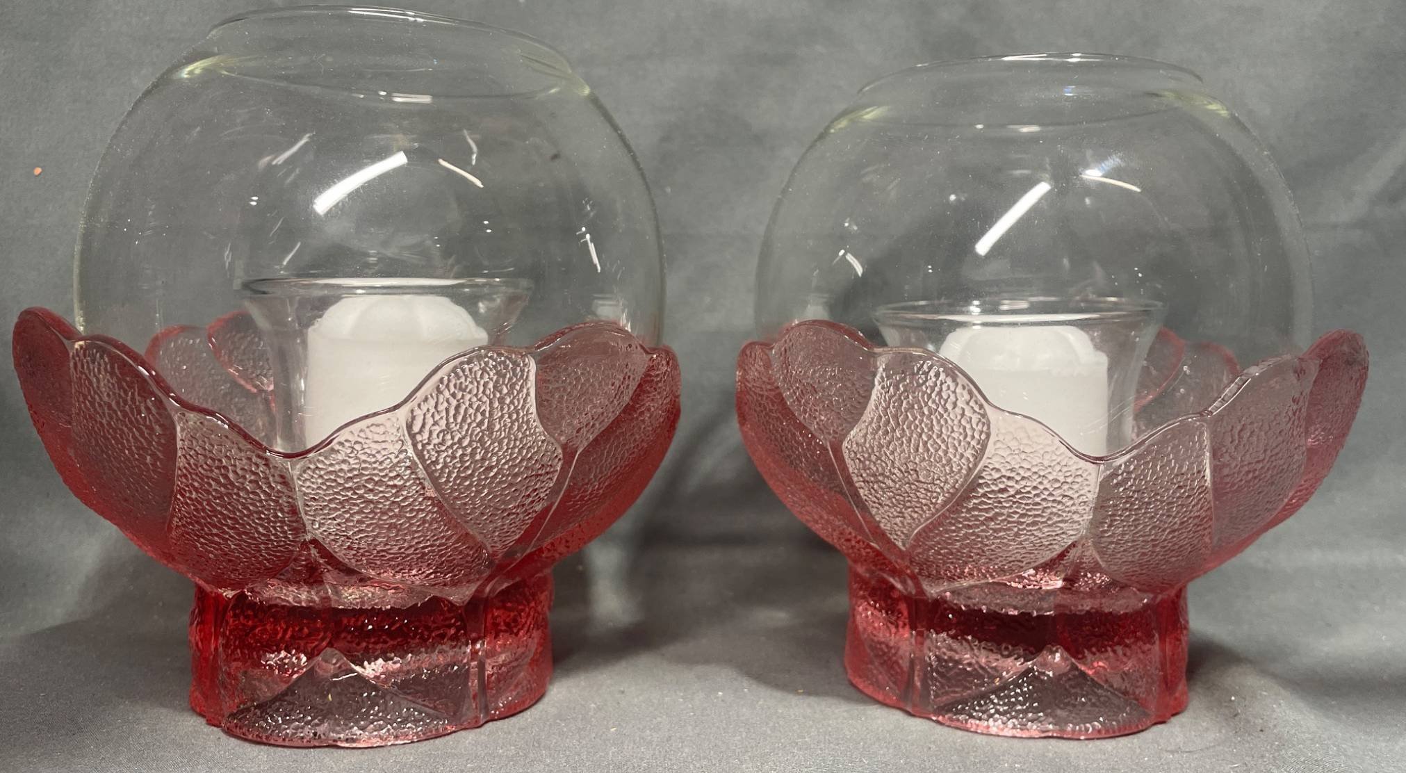 6038 2-Pink Textured Glass Candle Holders with Globe Shades 5”x5”x6”