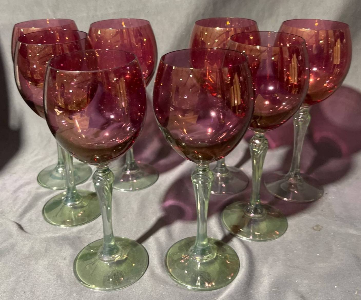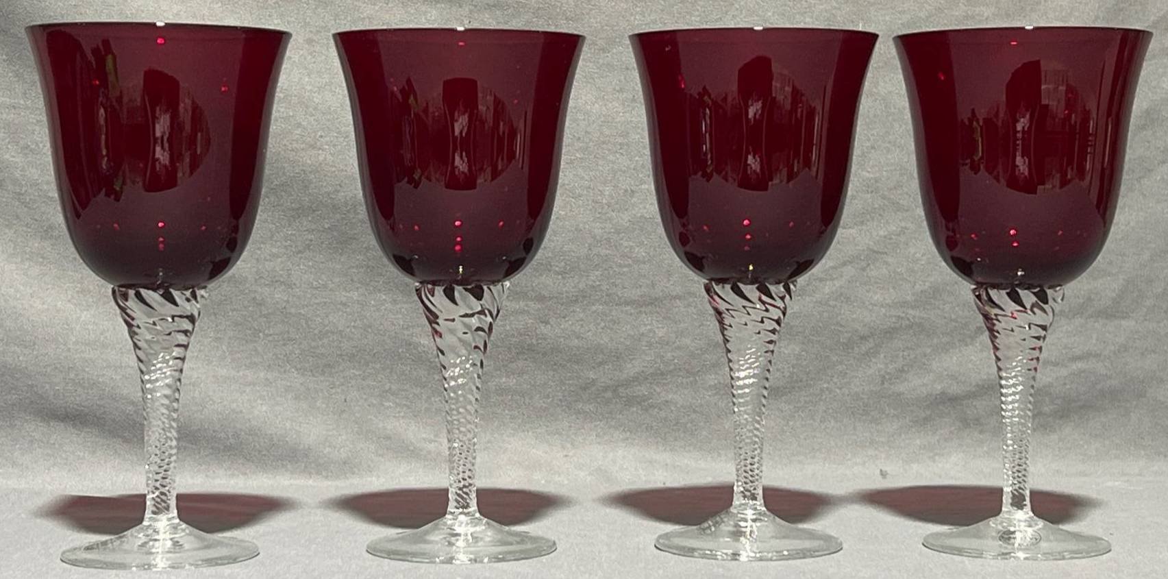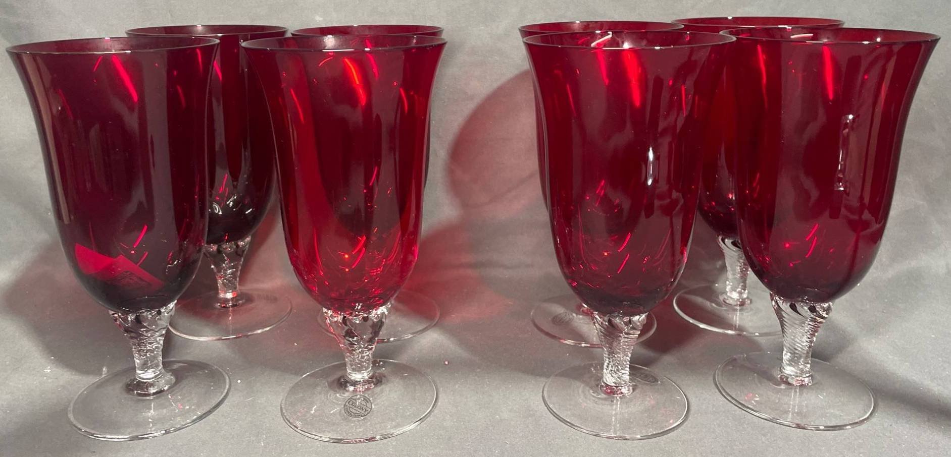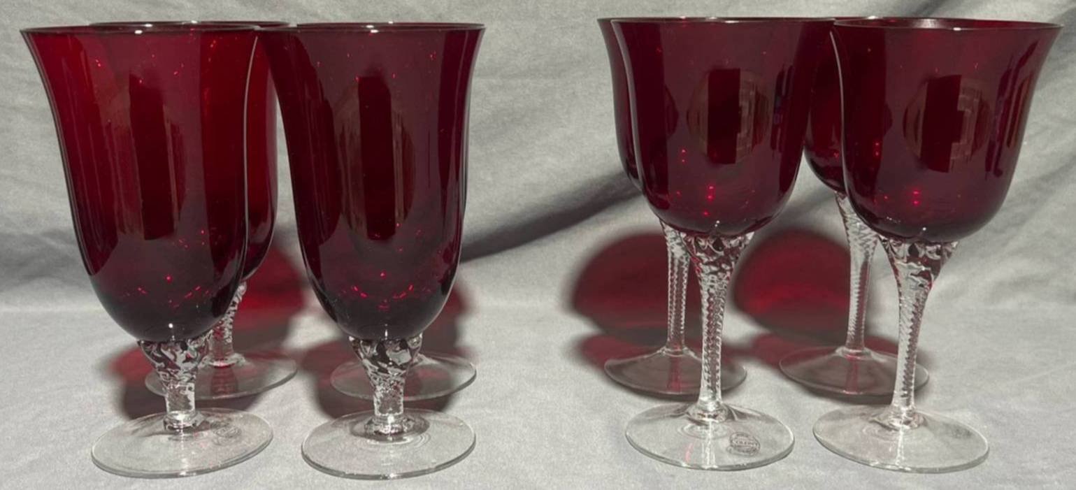 6055 12 Ruby-Colored Stemmed Glasses with Etched Transparent Stems by Colony, Made in Czech Republic 3.5”x7”