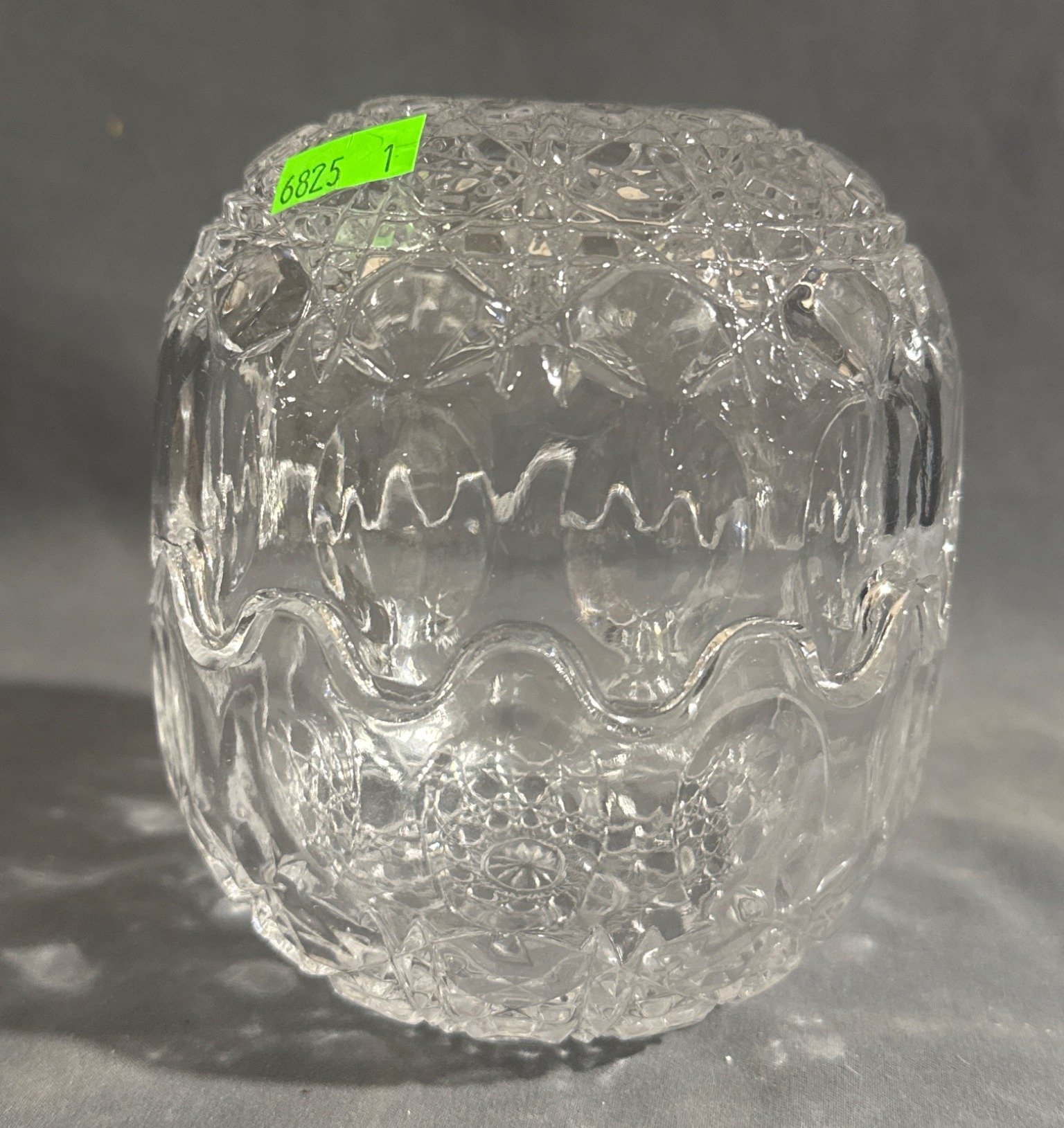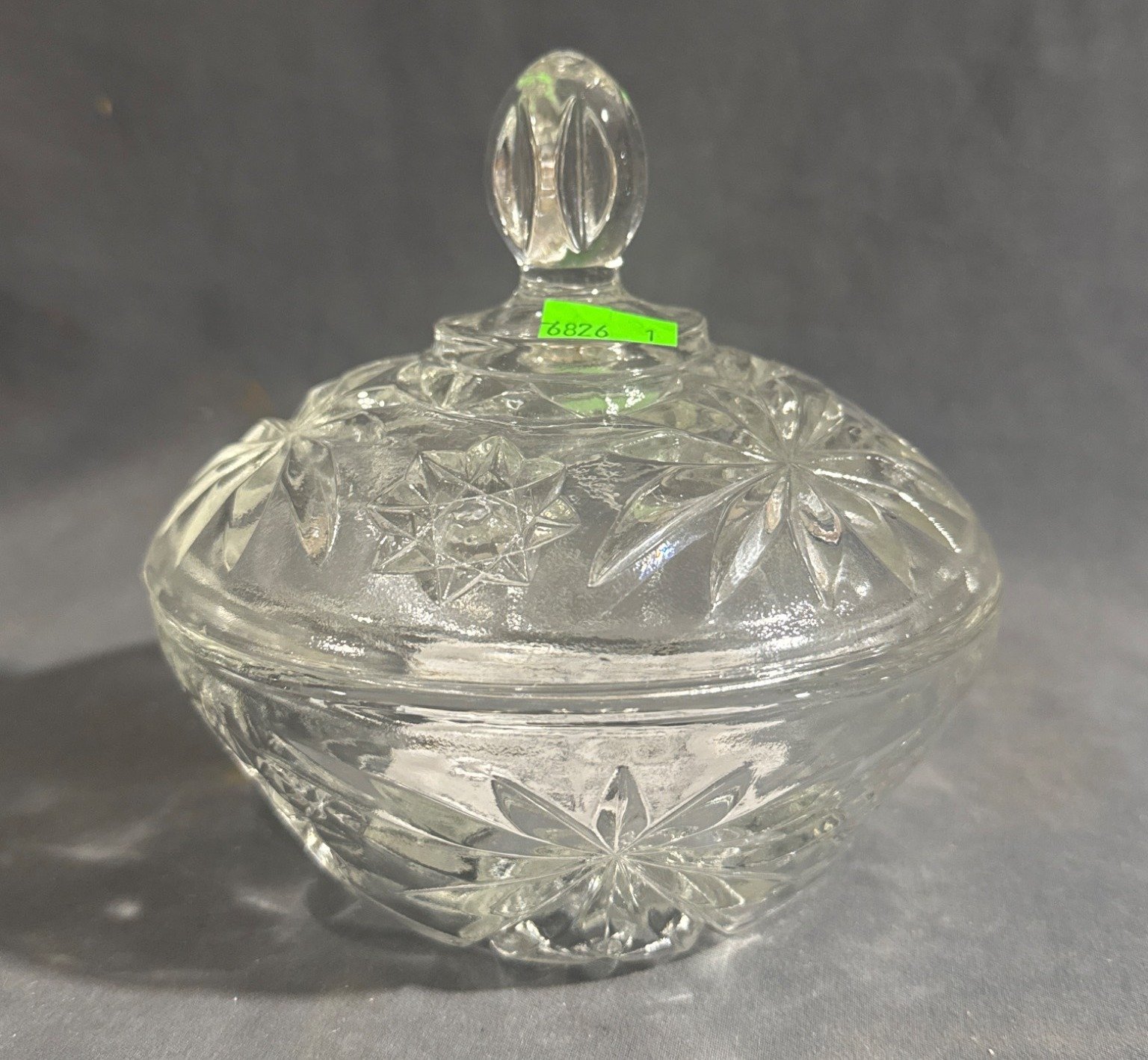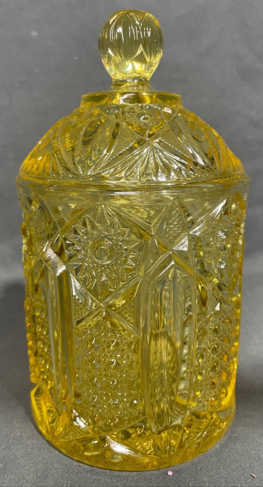 6053 Tiara Yellow Pressed Glass Lidded Jar with Geometric Patterns 3.5”x8”