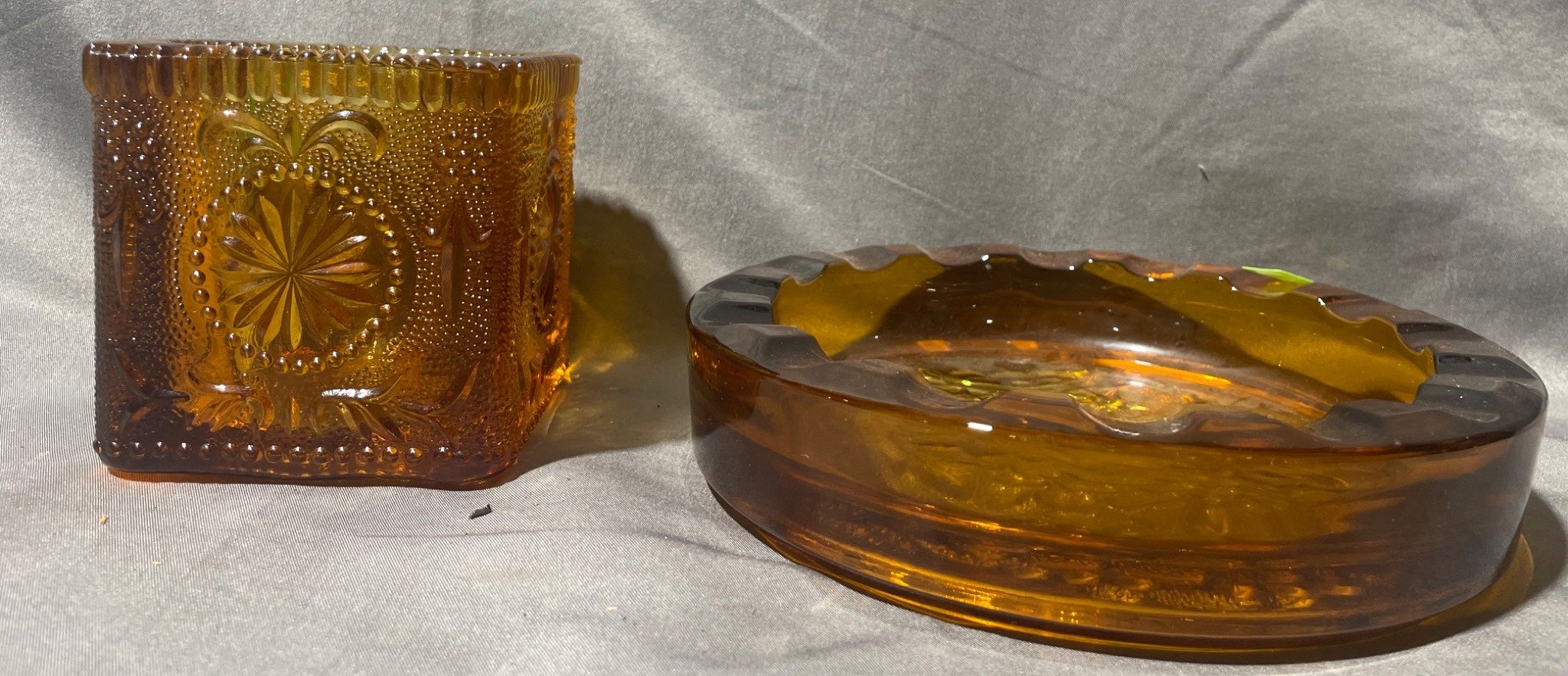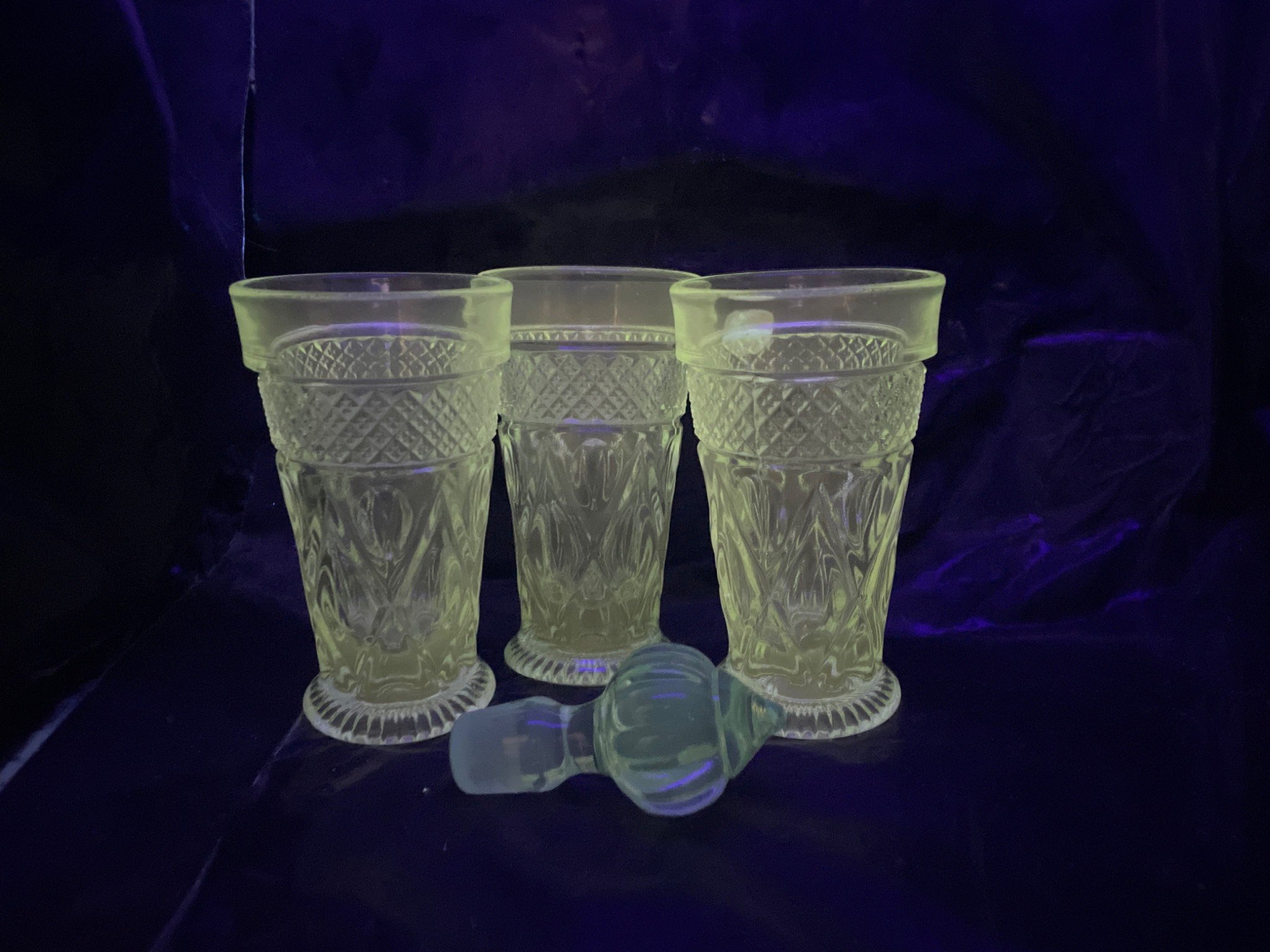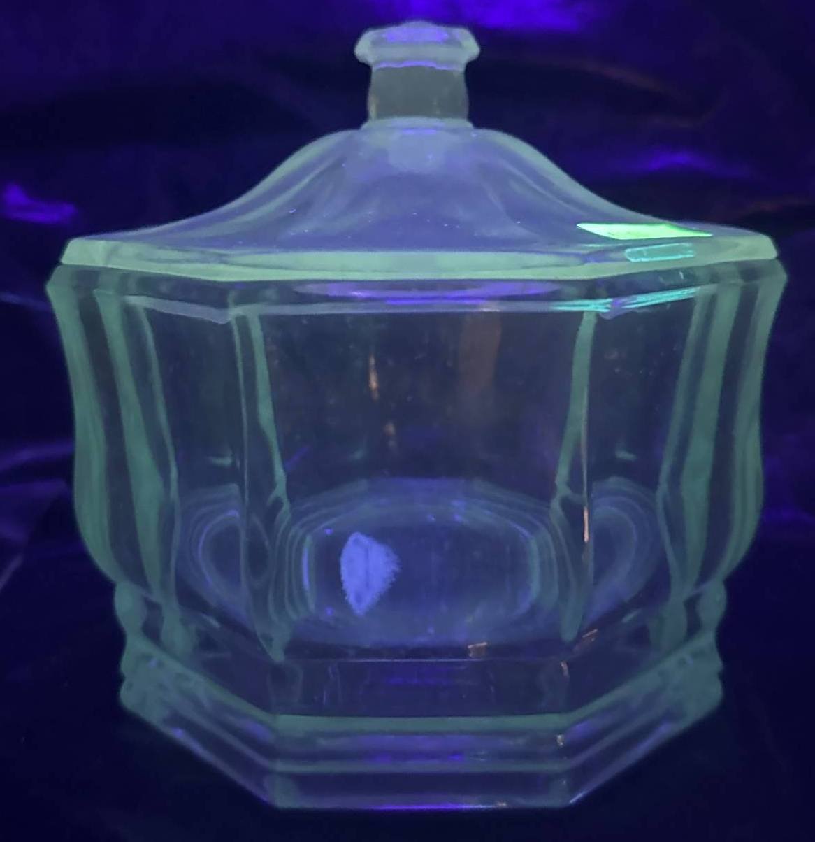 6053 Tiara Yellow Pressed Glass Lidded Jar with Geometric Patterns 3.5”x8”