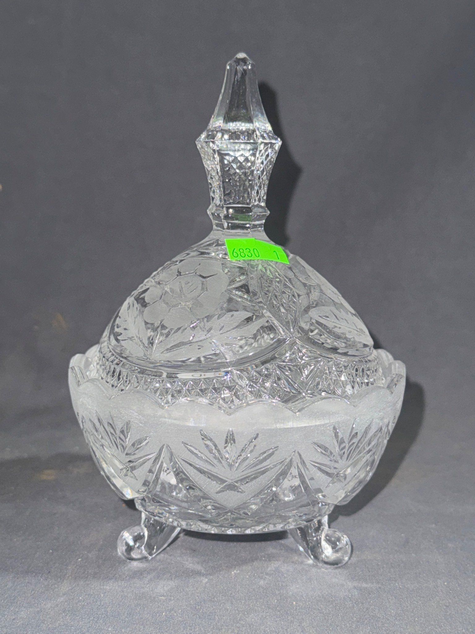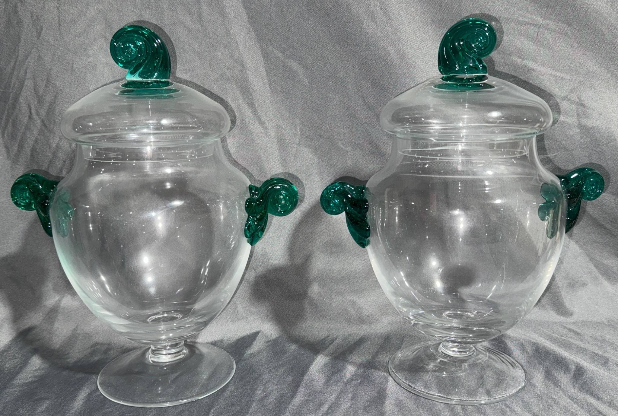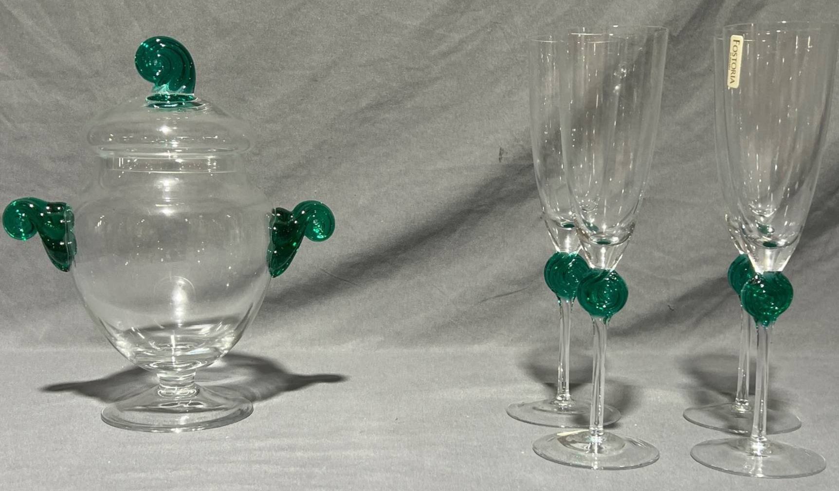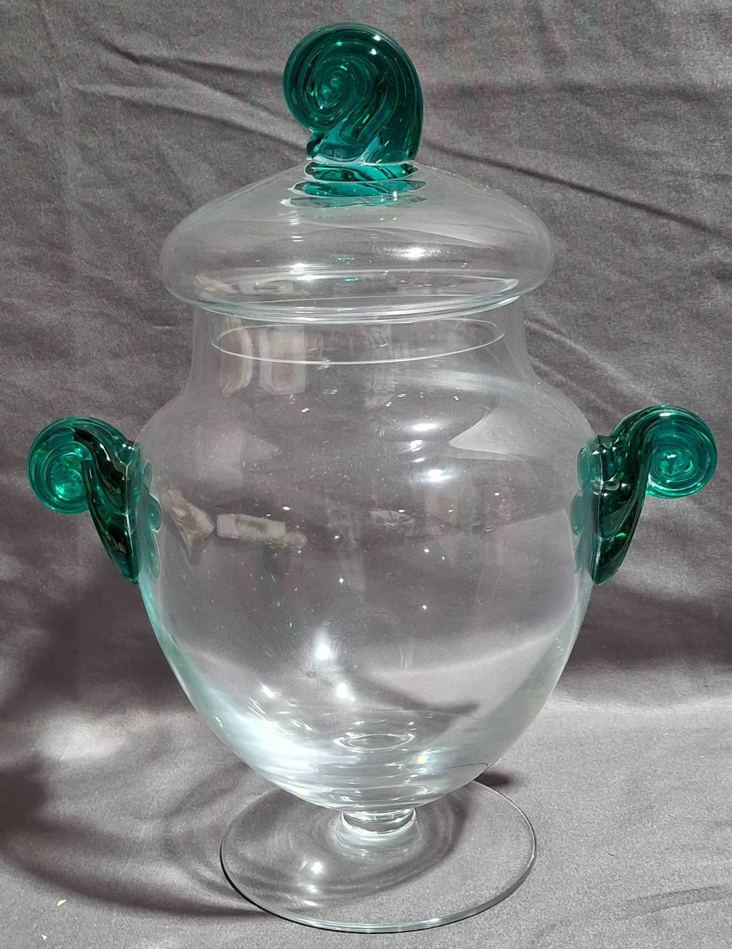 6057 Fostoria Clear Glass Lidded Jar with Green Swirl Handles 9?